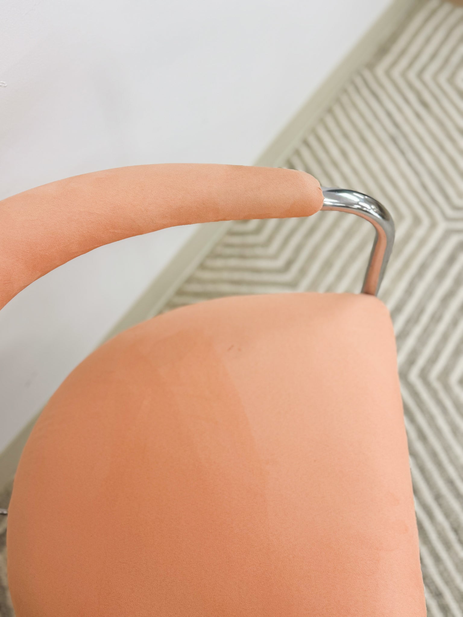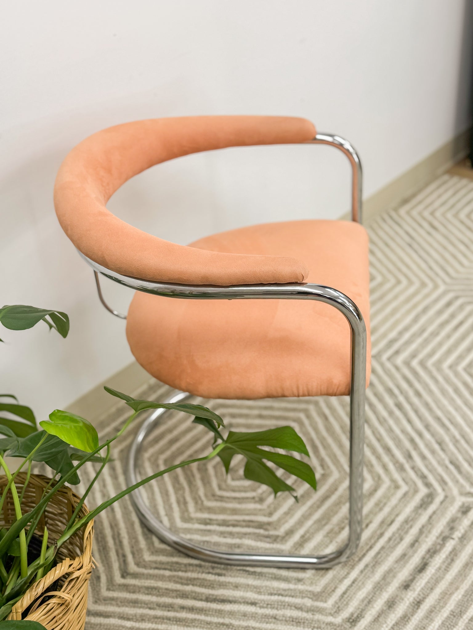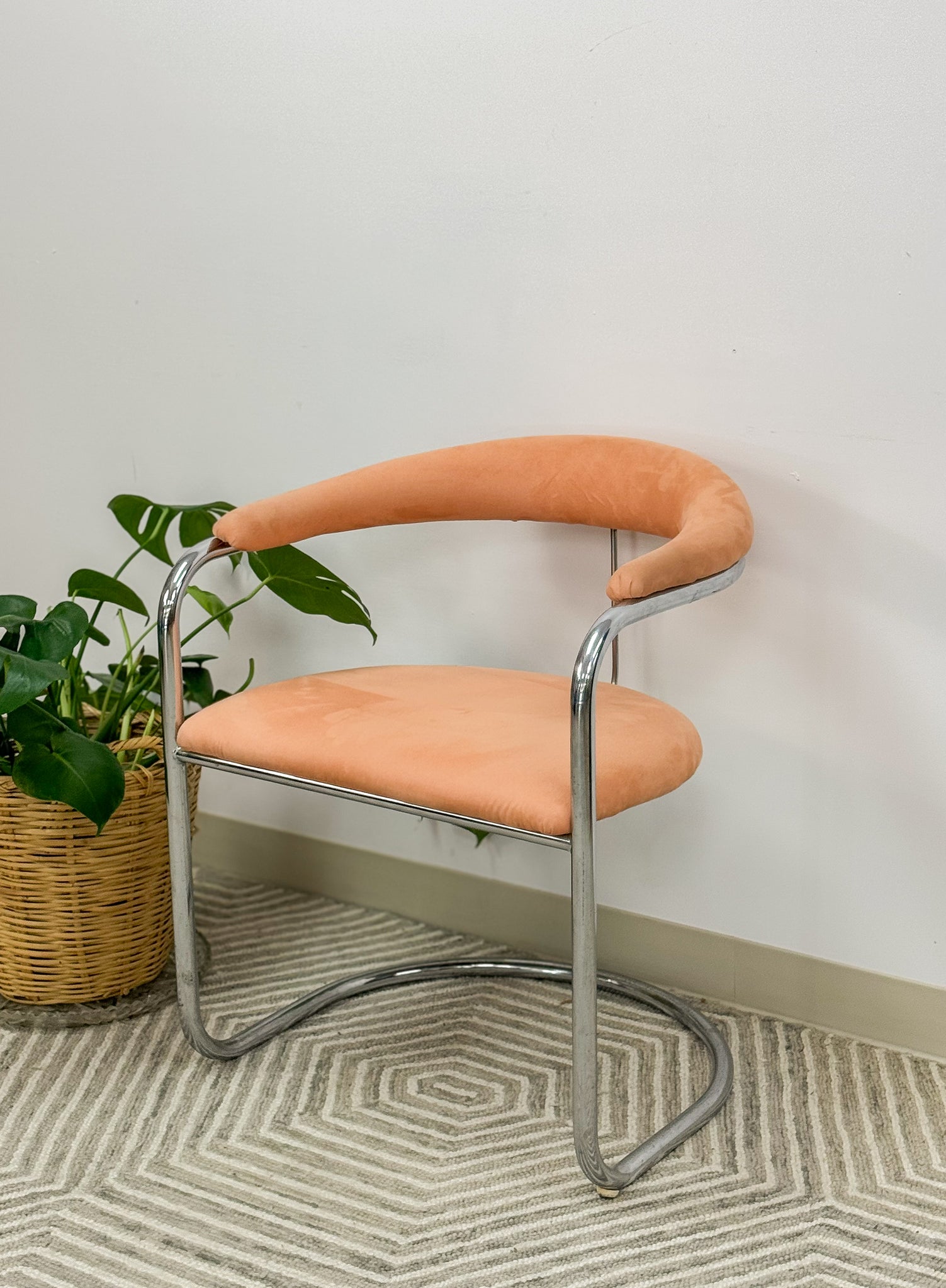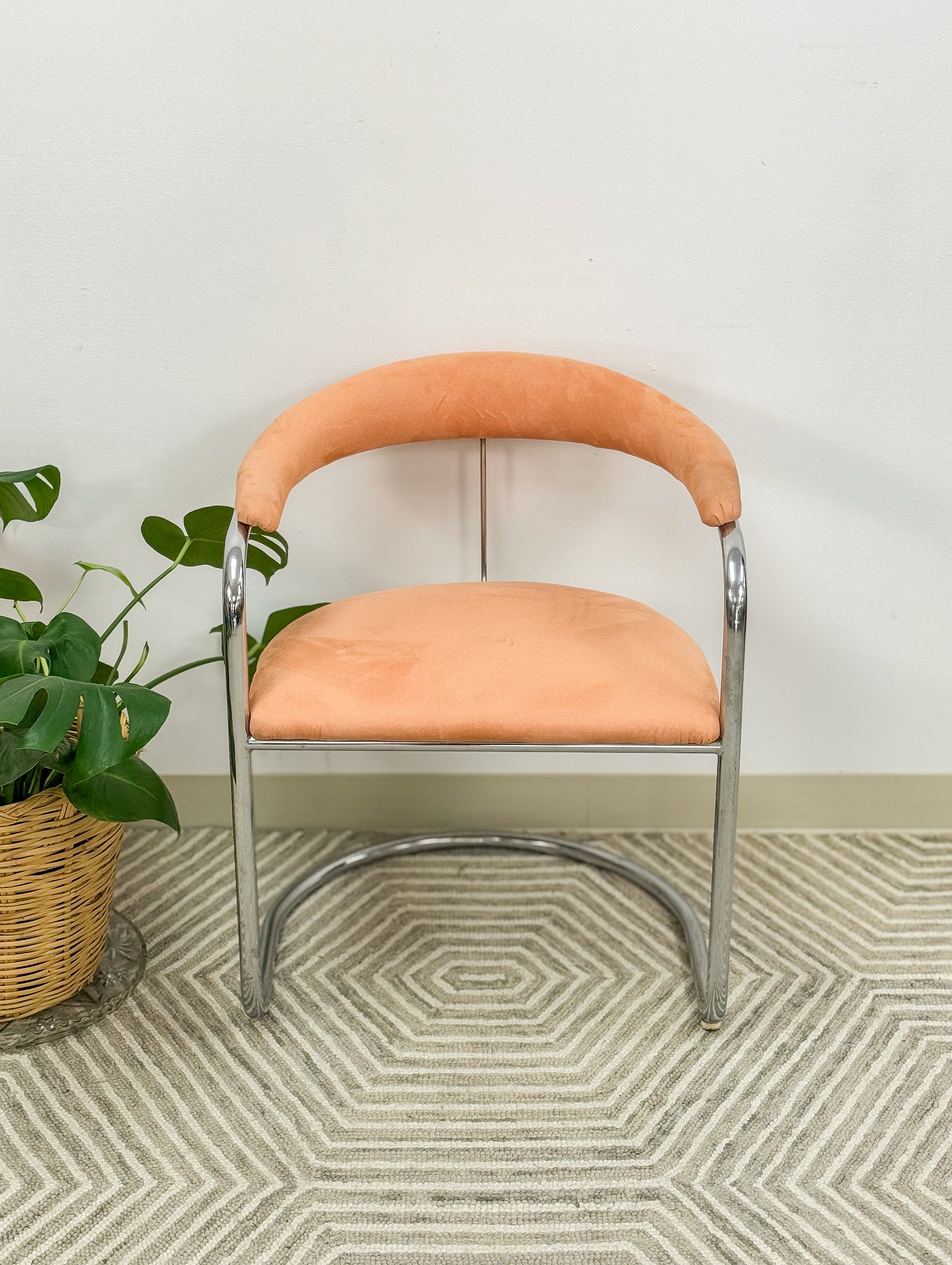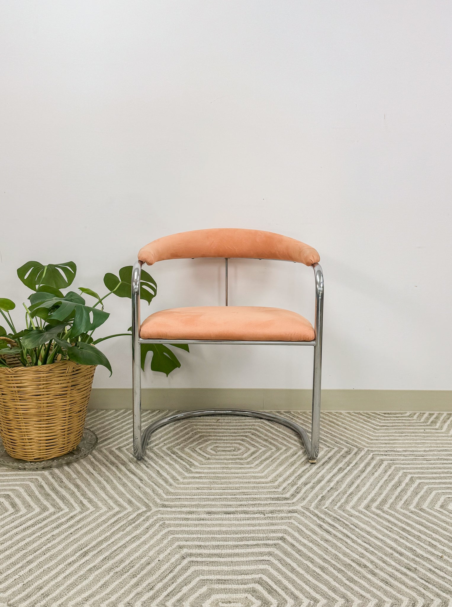 This is a beautifully upholstered Anton Lorenz vintage chair. It has a notable design with a chrome frame. The upholstery is original and is almost the perfect flamingo pink- a timeless pop of color. There is one tiny spot on the upholstery as shown but it hasn’t been professionally cleaned so it may come out.
