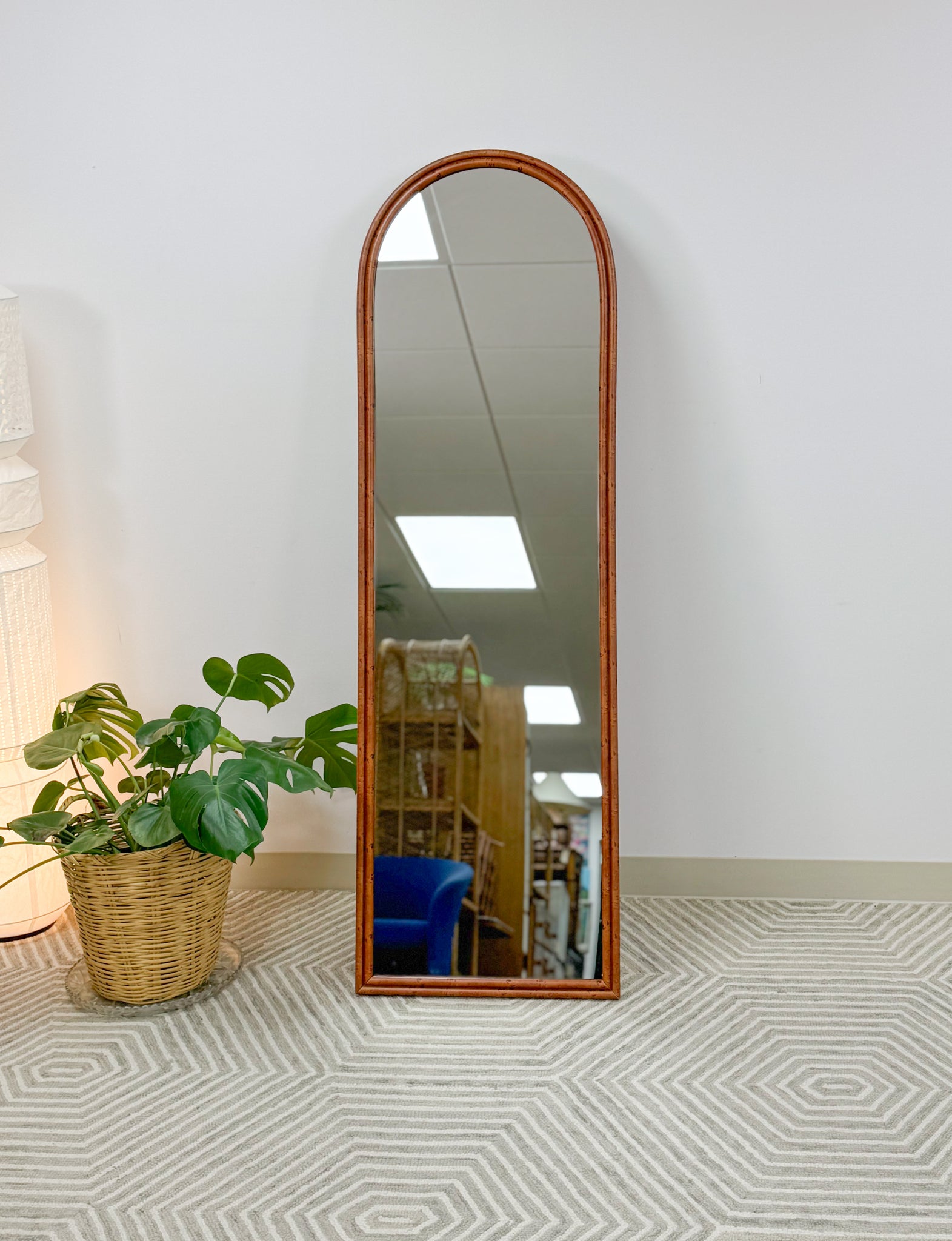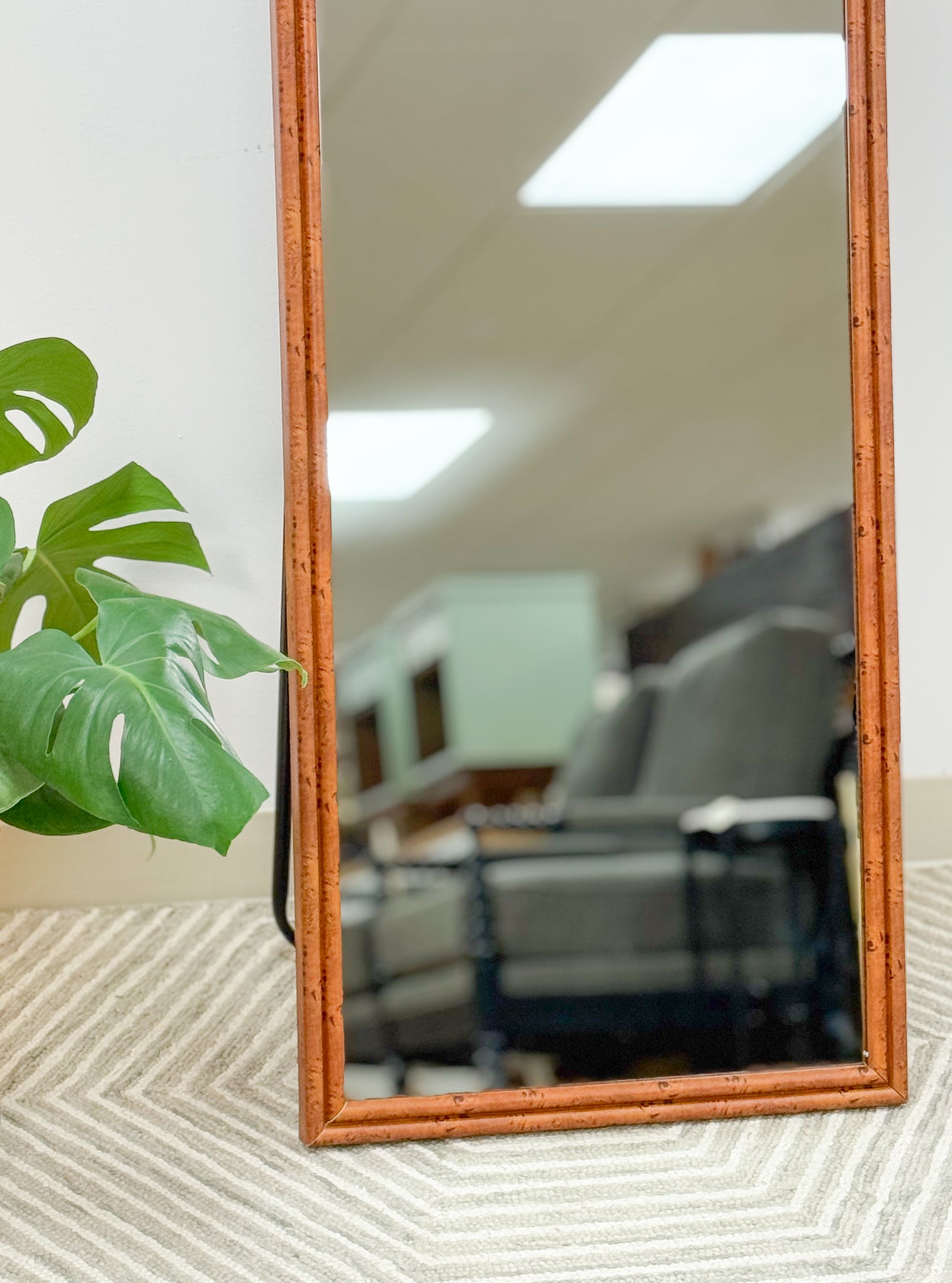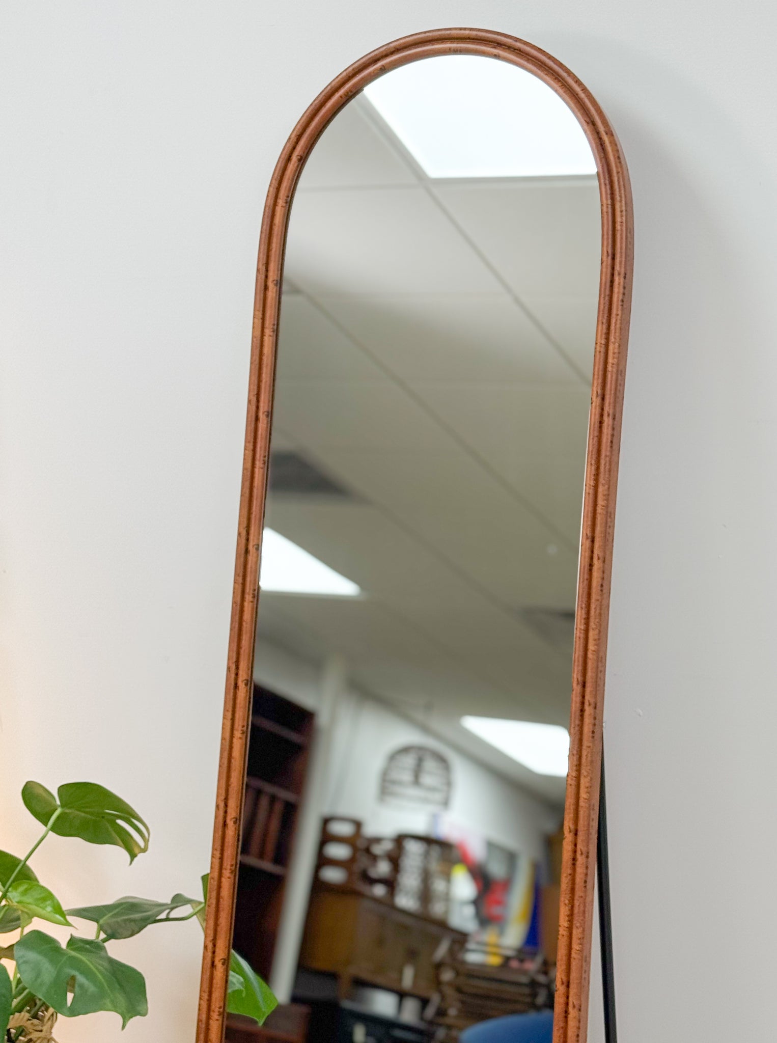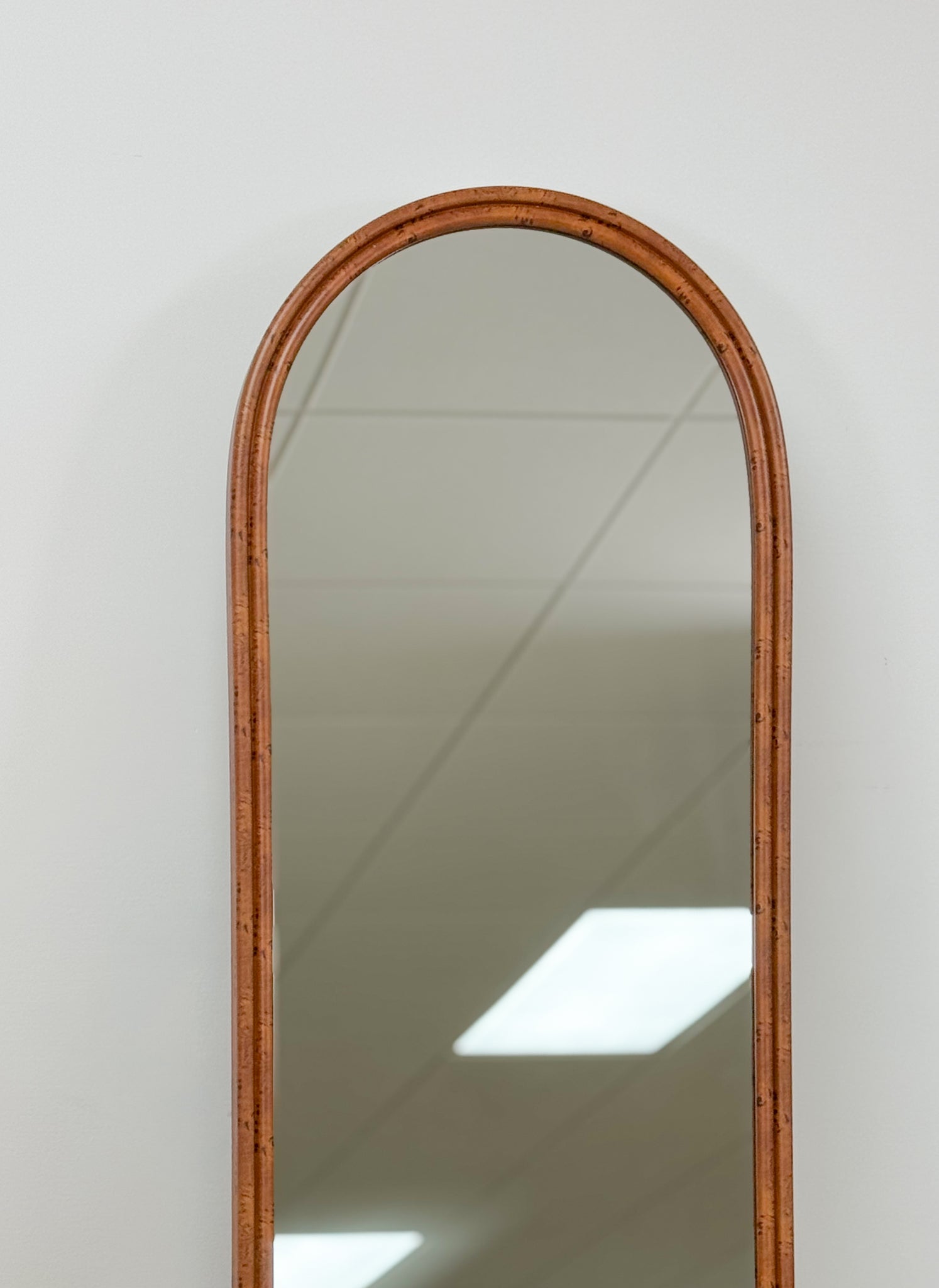This is a beautiful full length mirror. It is a burlwood style arched mirror with a fold out standing option. It is like new and has no damages or scratches. It is a Burlwood finish but not actual wood.