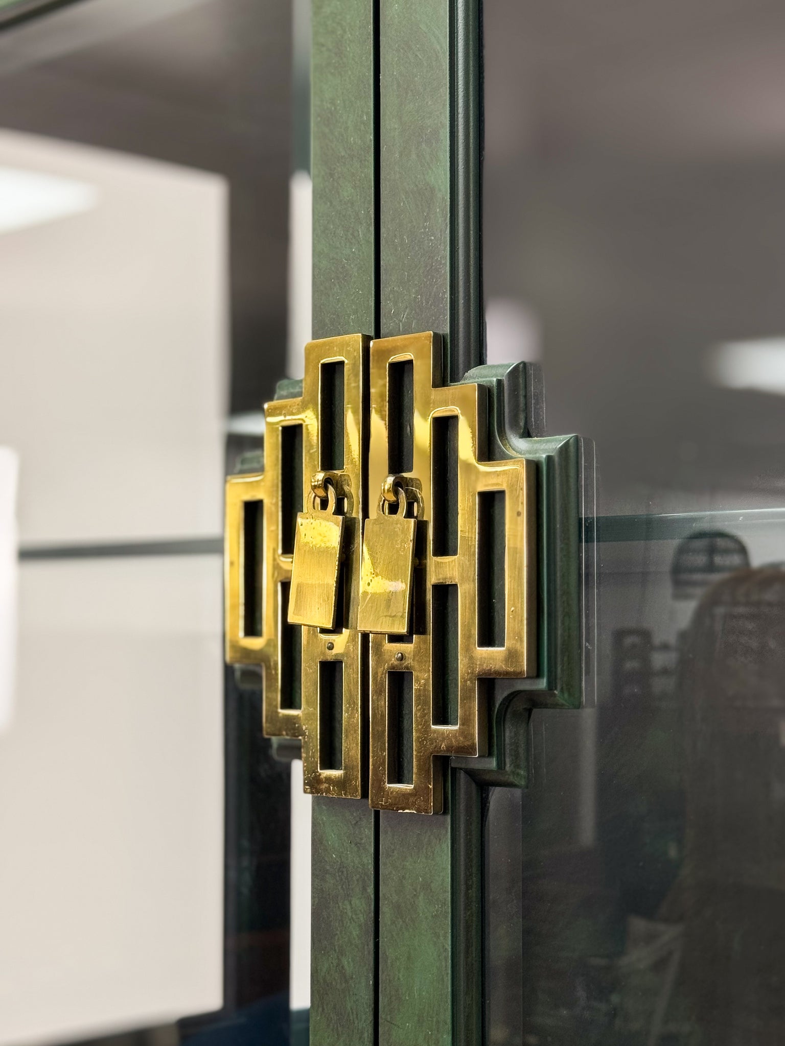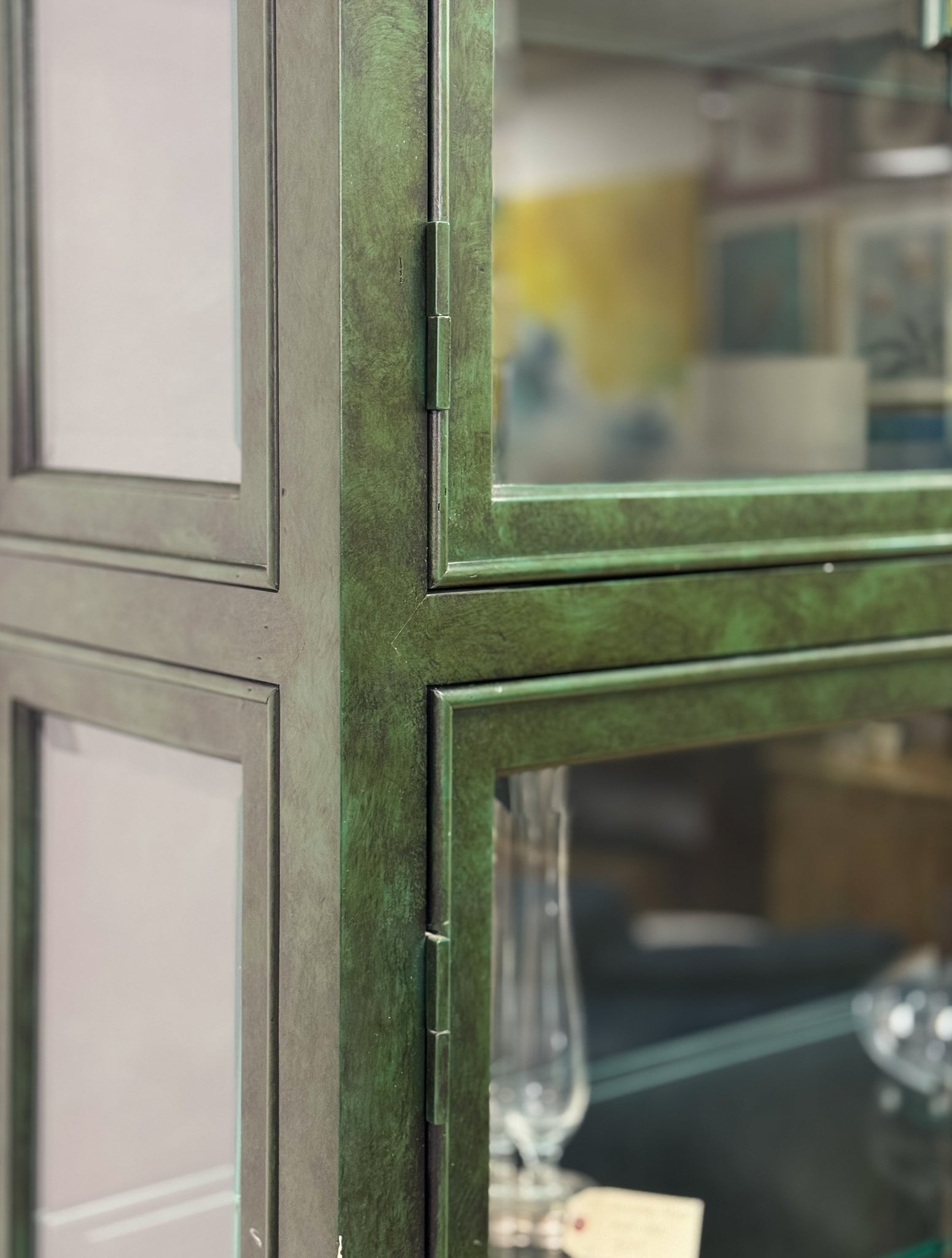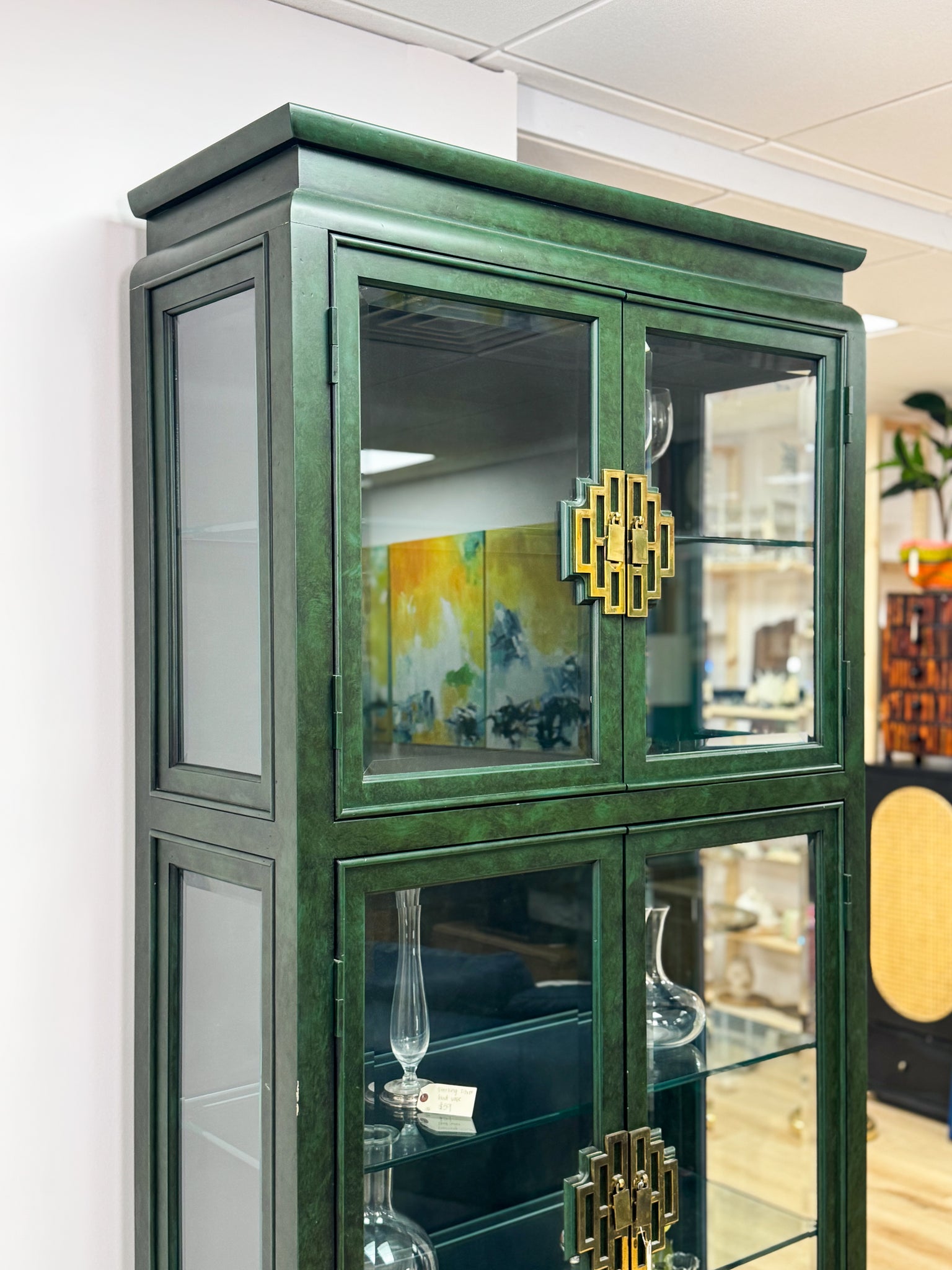 This is a beautiful refinished chinoiserie style curio cabinet. It has a green stippled finish and a lovely satin/matte look. The hardware is all solid brass and the doors latch securely. It is sturdy and timeless.