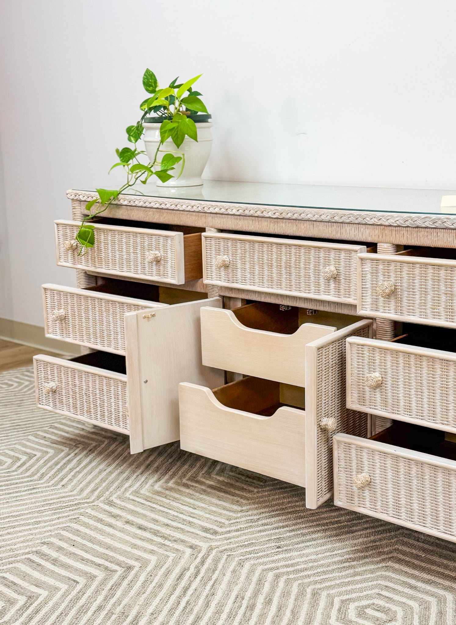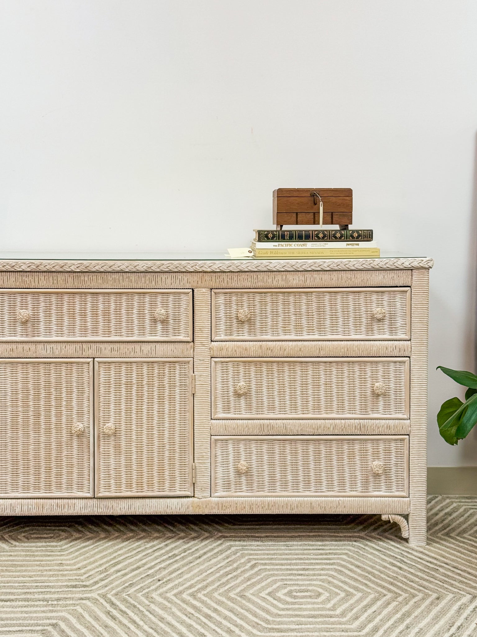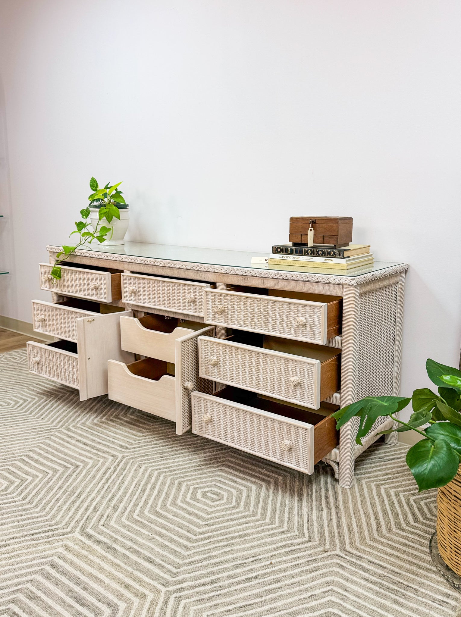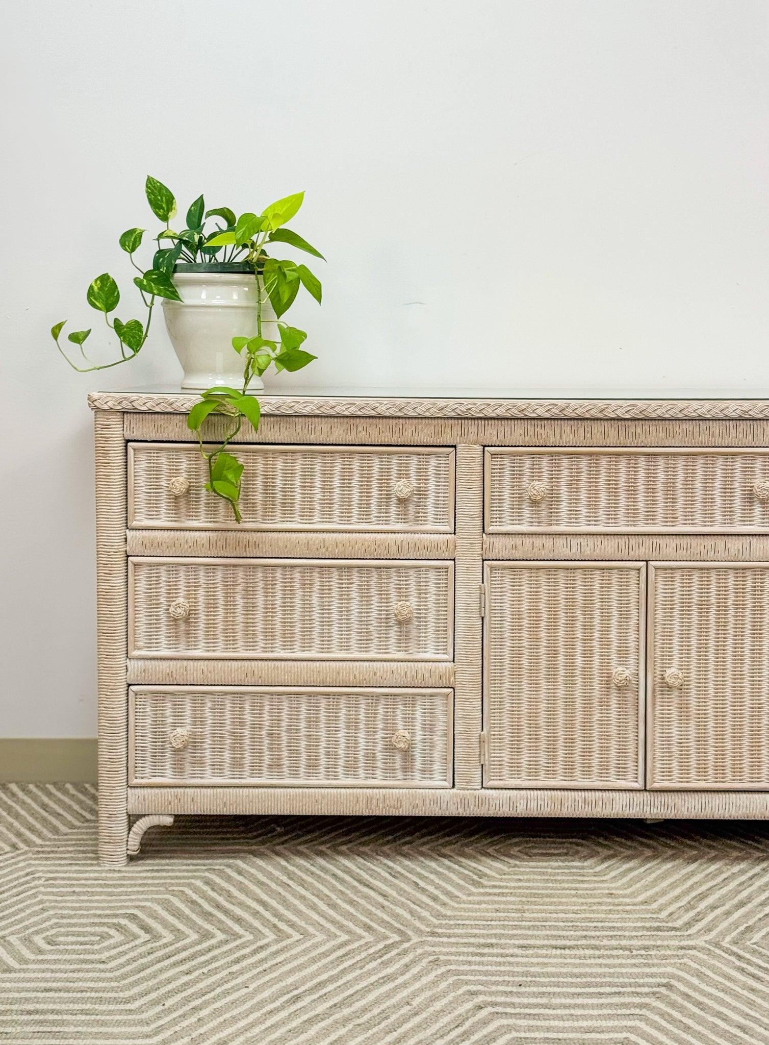 This is a beautiful original Henry Link dresser by Lexington. It is in excellent like new condition and has a glass top for durability and function. The drawers are solid wood and glide with ease.