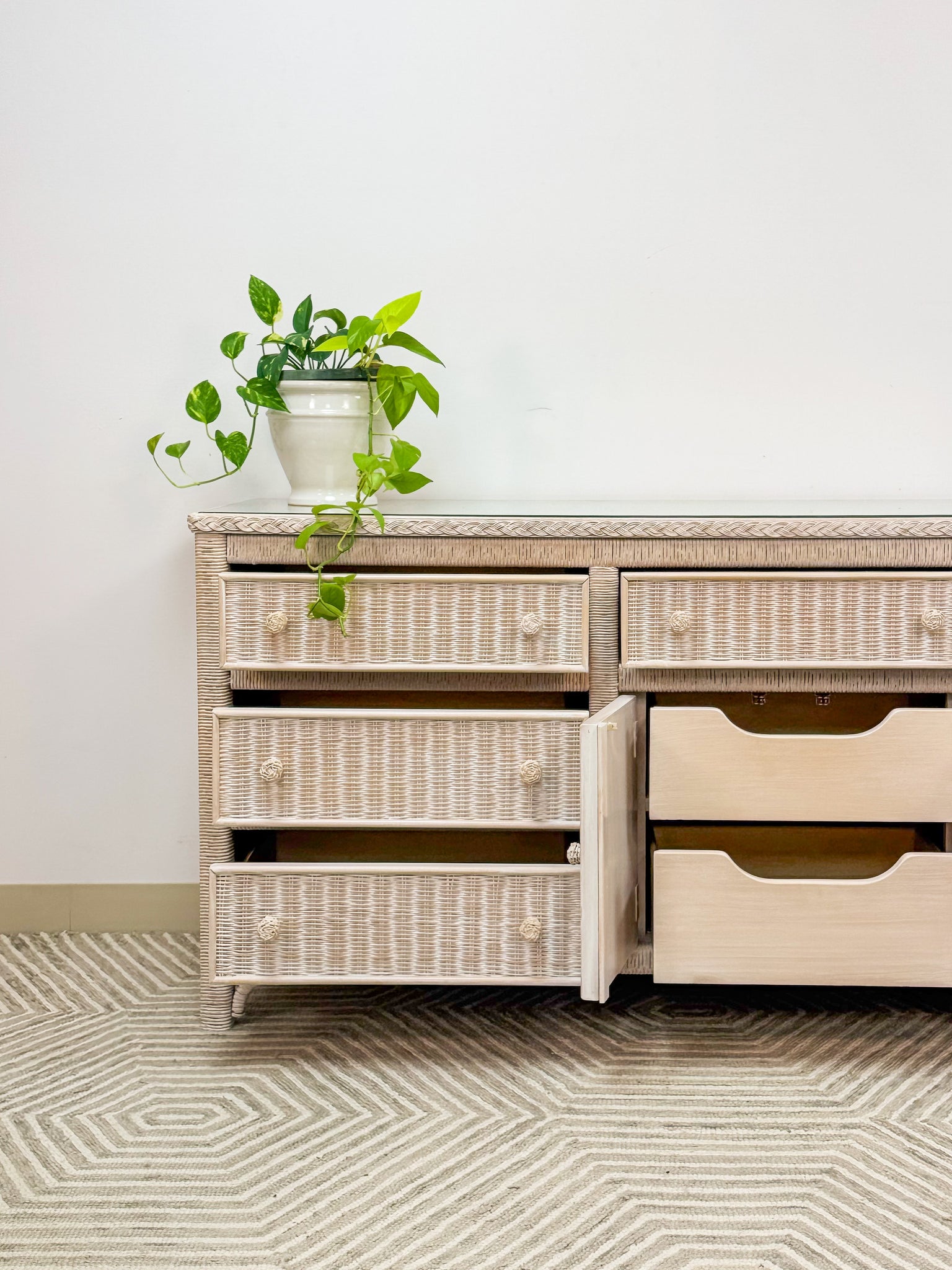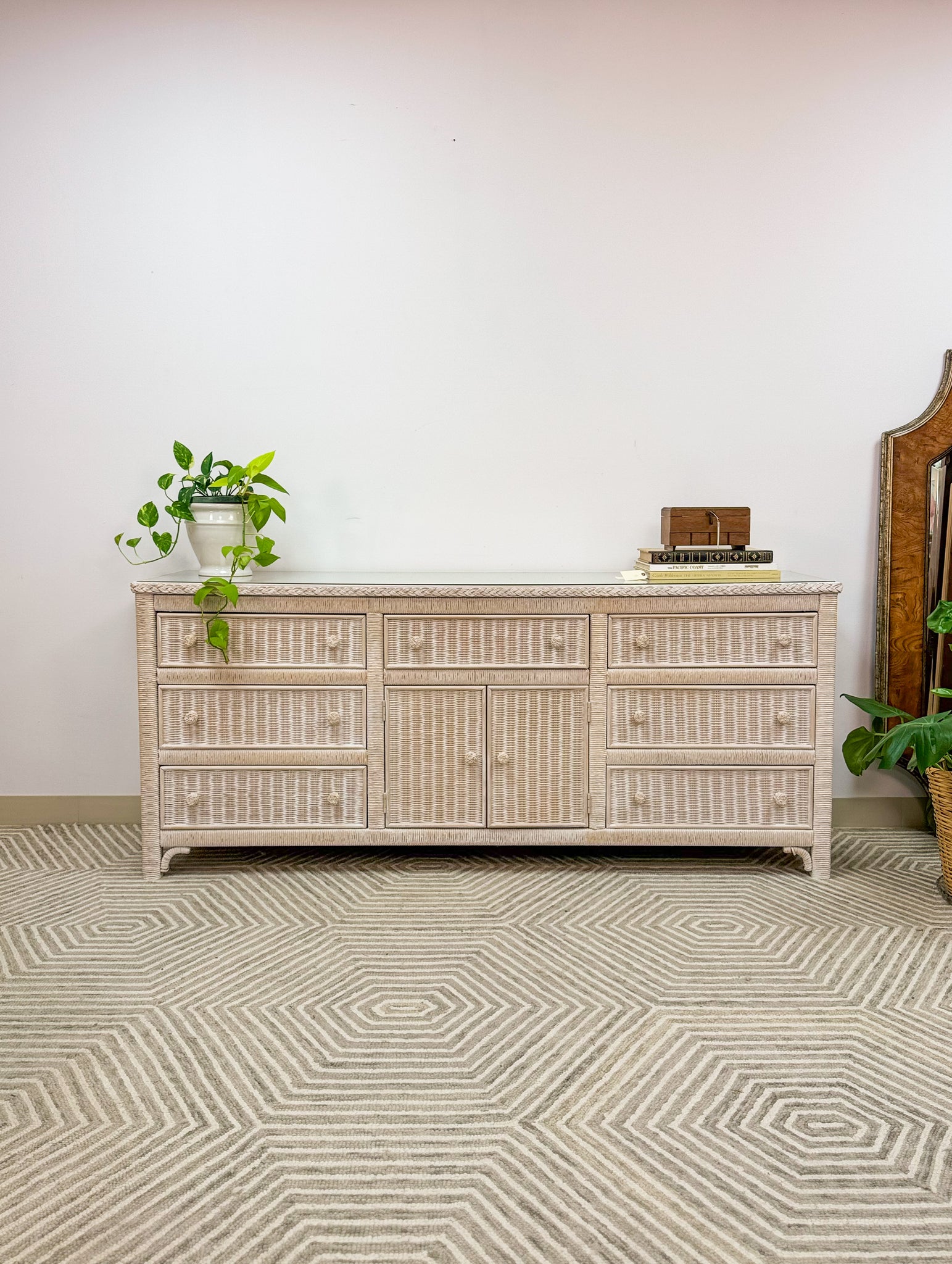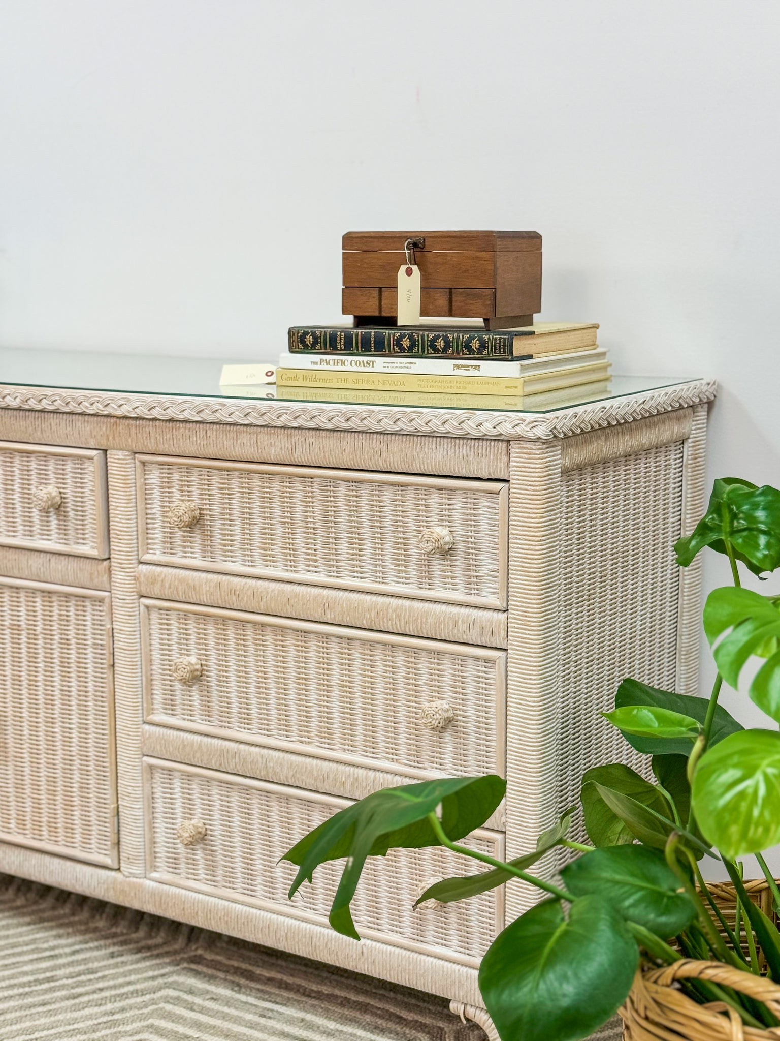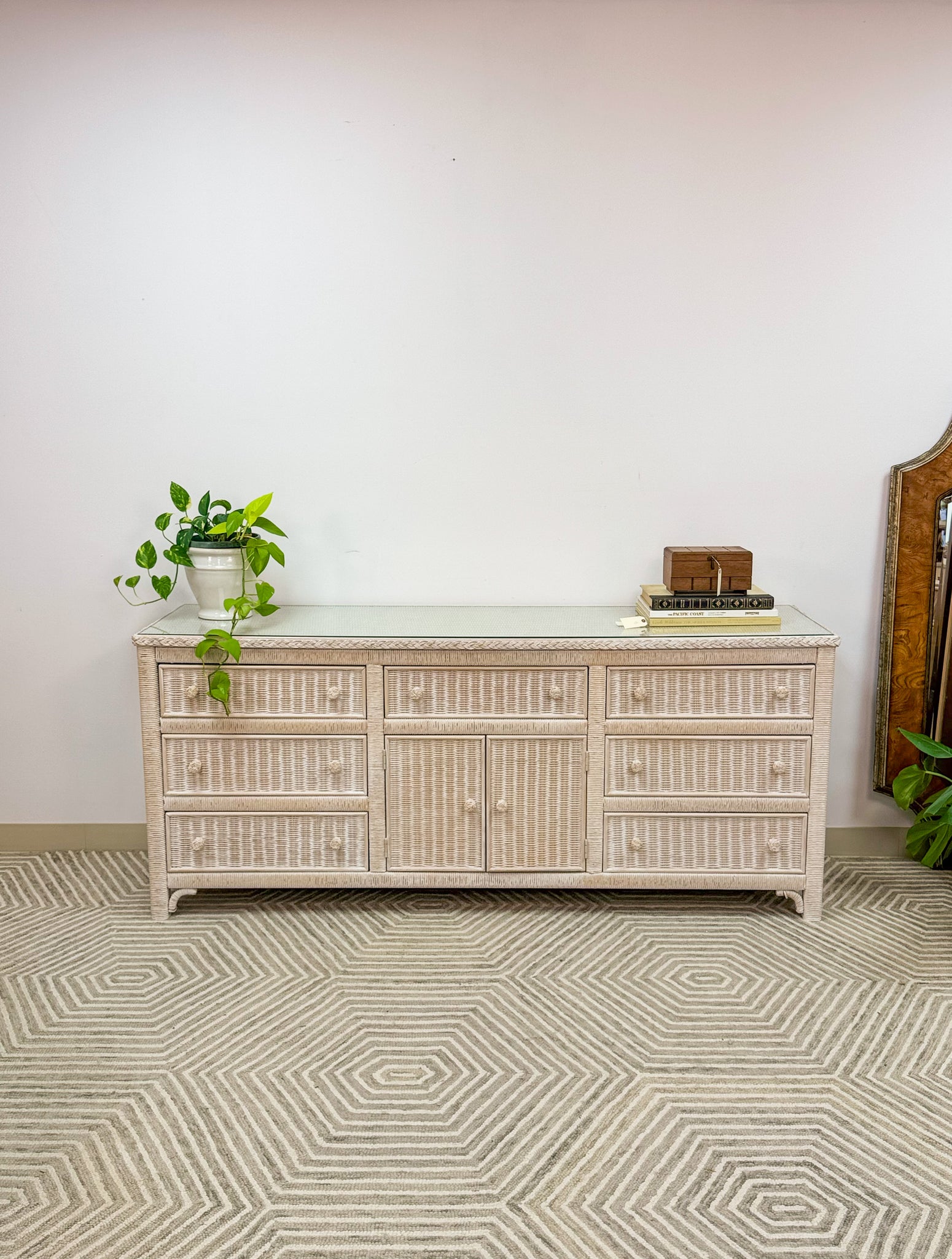 This is a beautiful original Henry Link dresser by Lexington. It is in excellent like new condition and has a glass top for durability and function. The drawers are solid wood and glide with ease.