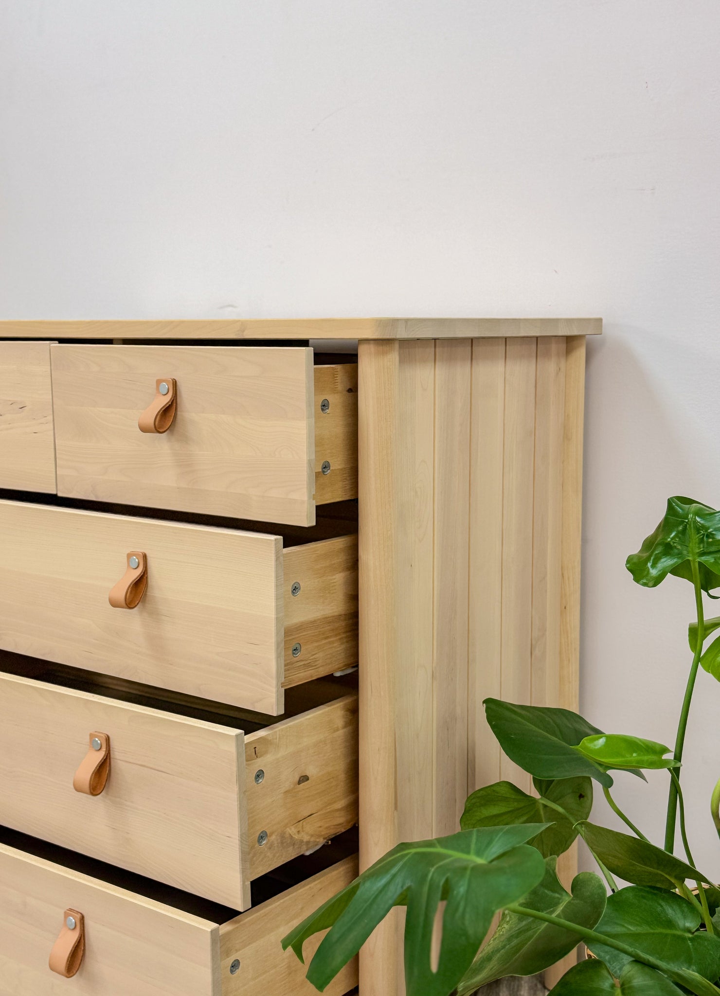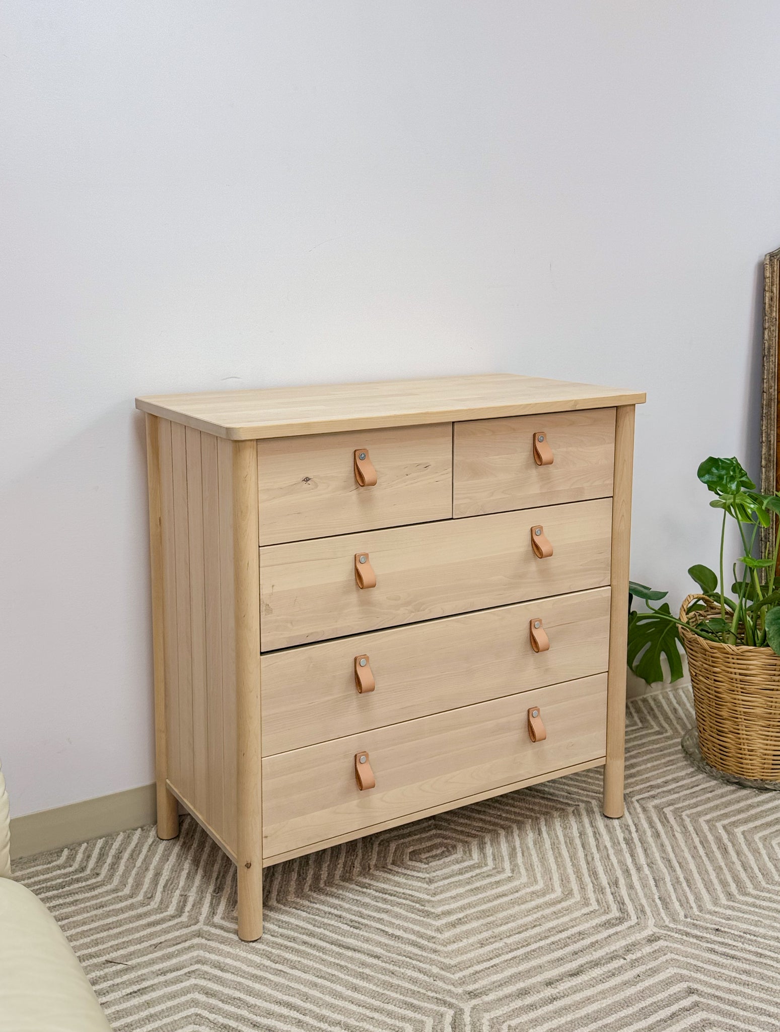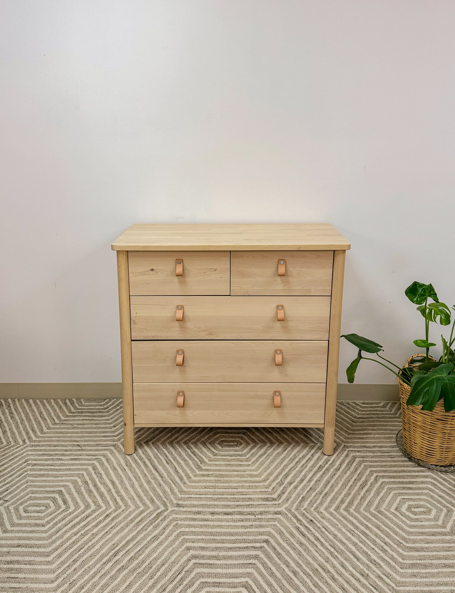 This is a beautiful solid wood ikea dresser. This piece is discontinued and collectible. It’s in great shape and has leather pulls. It’s a lovely accent piece and the light wood is such a versatile tone.