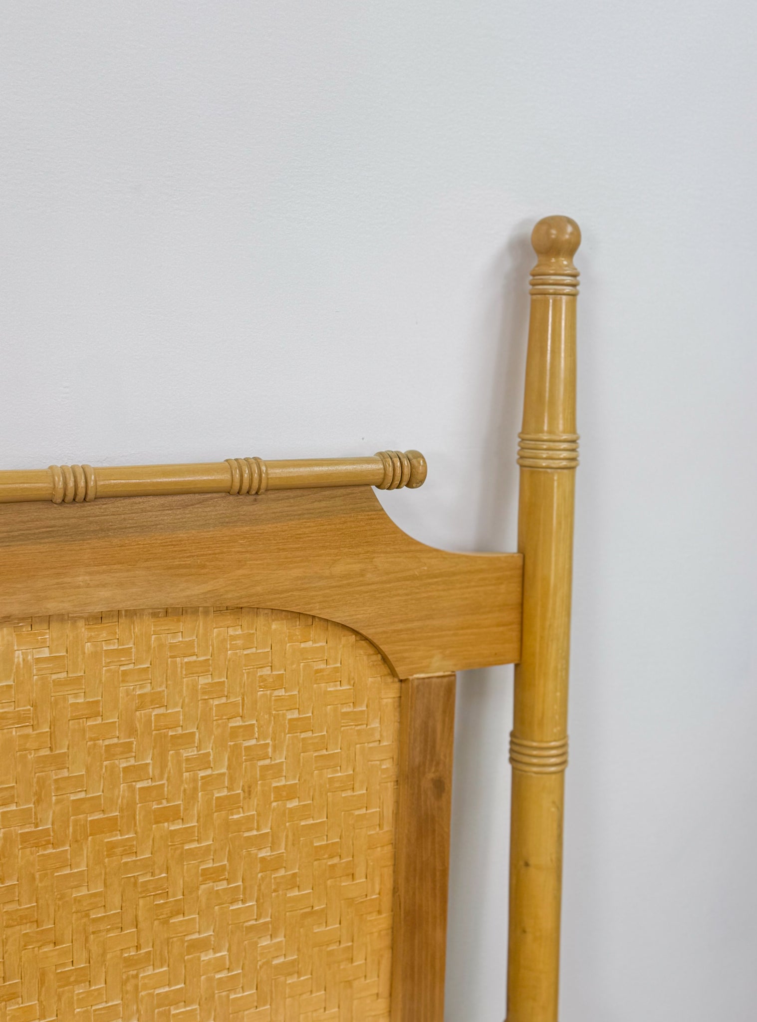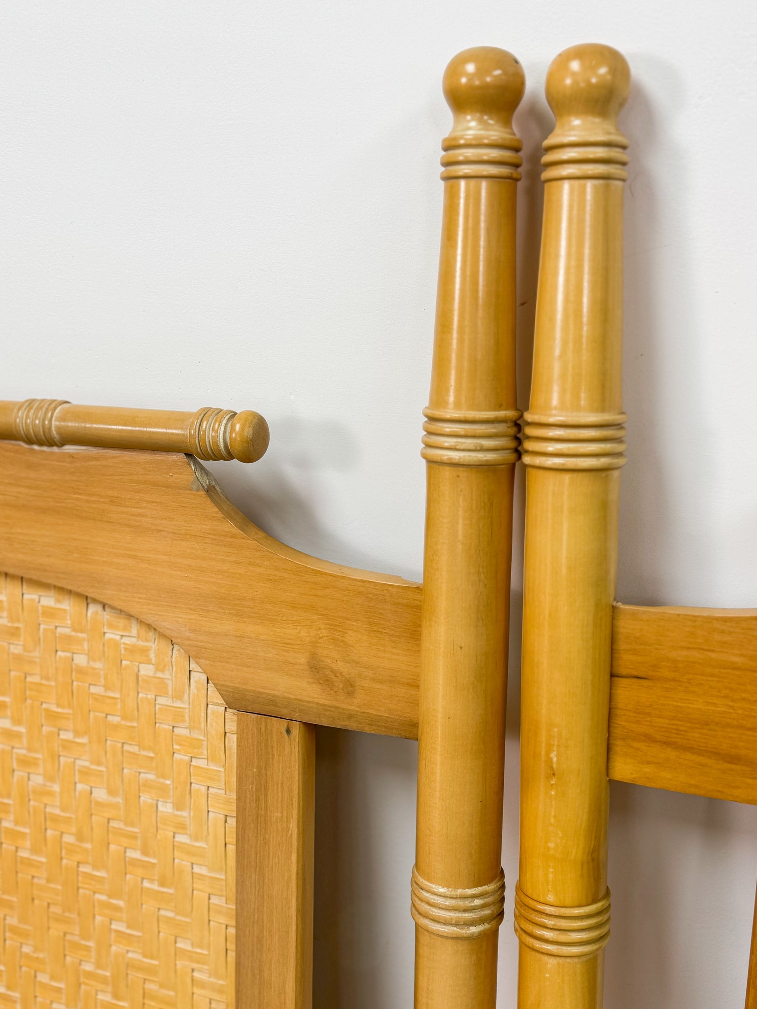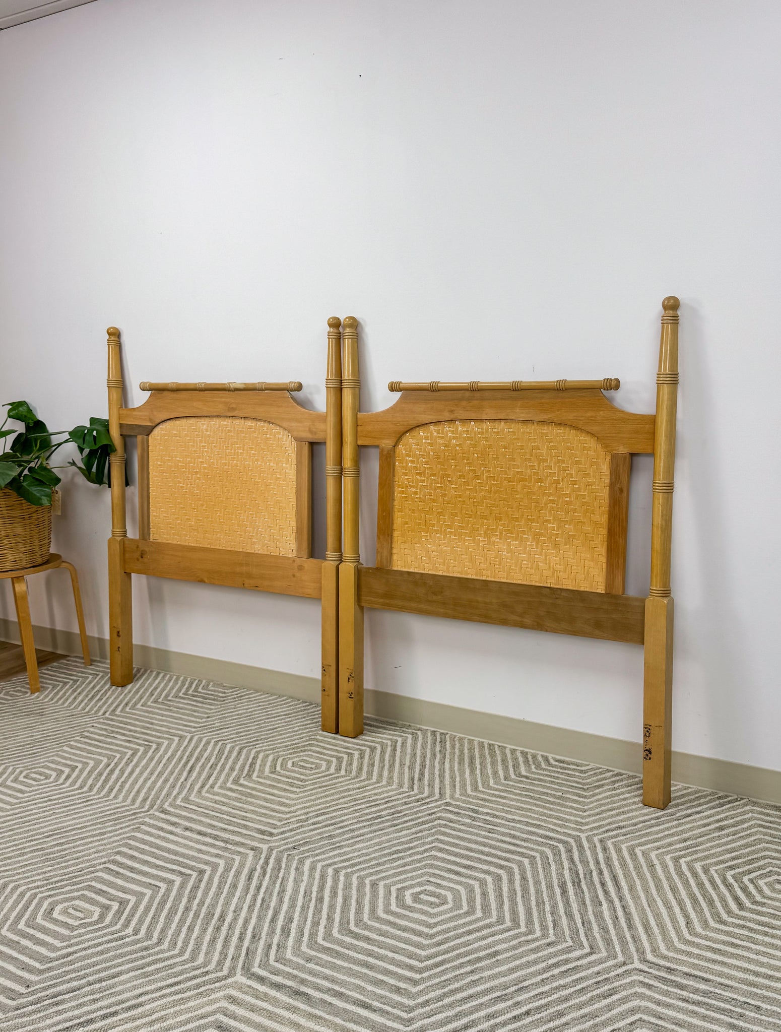 This is a beautiful pair of twin nightstands. These could also be put together and function as a king headboard. They are a faux bamboo made of wood and have a woven parquet detailing. They are a gorgeous 2-tone warm honey color and are easy to attach to standard twin or king bed frames.