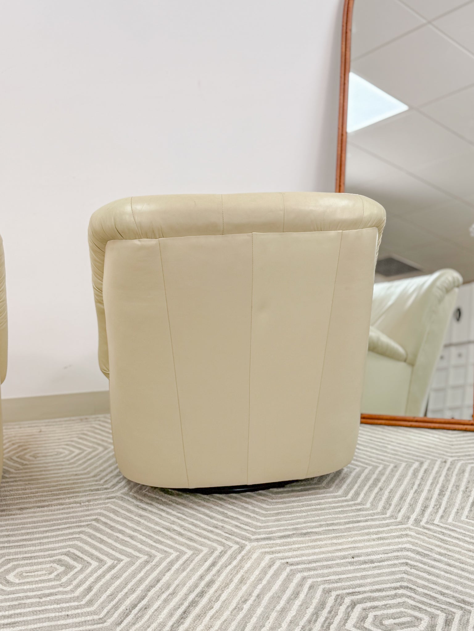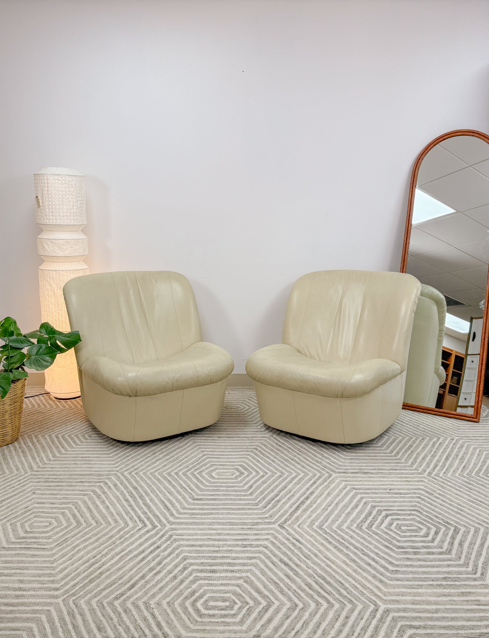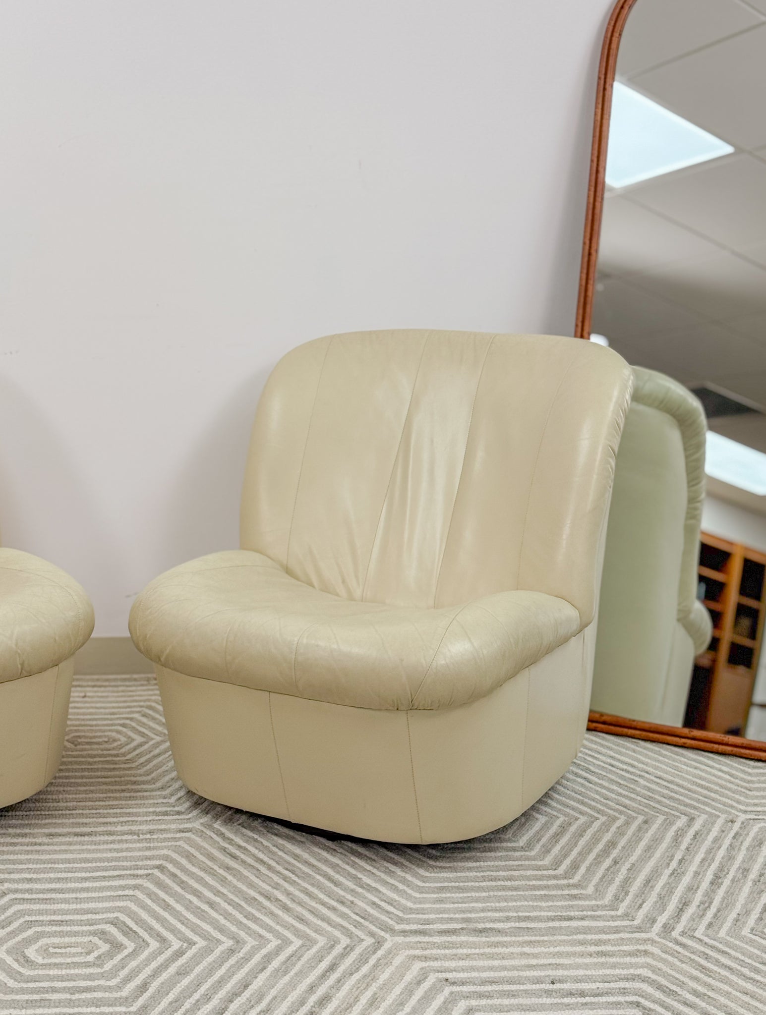 This is a beautiful pair of retro leather postmodern swivel gliders. They are a lovely creme color and are incredibly comfortable. The leather has a few small scuffs here and there as shown in photos- they are minor.