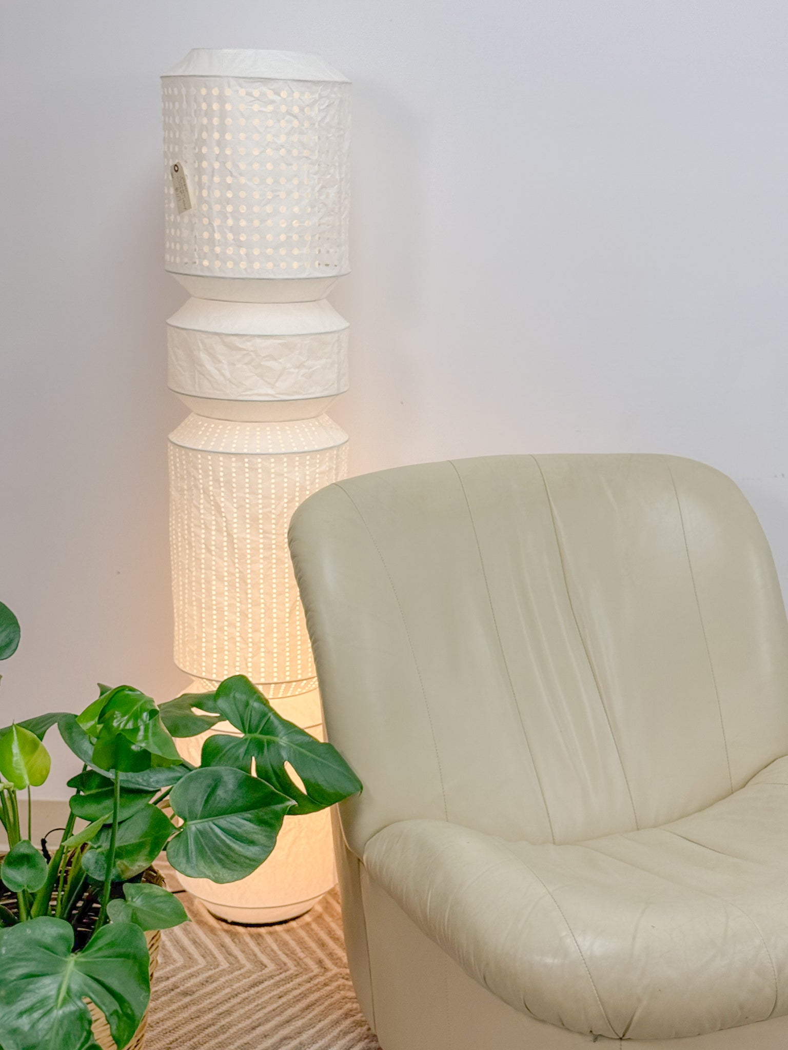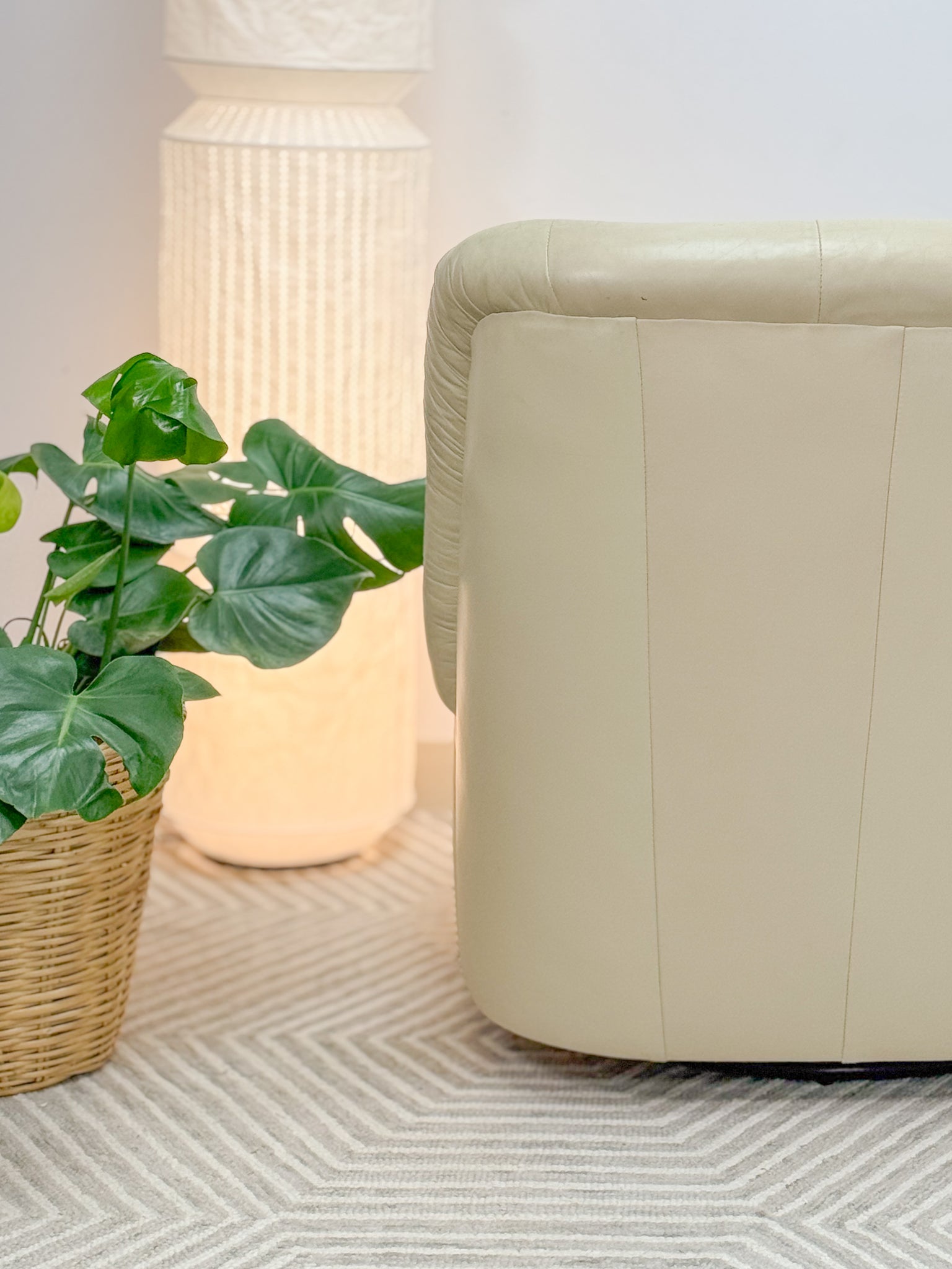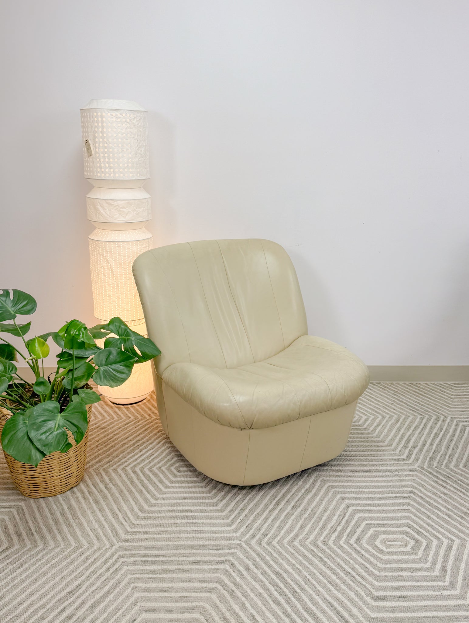This is a beautiful pair of retro leather postmodern swivel gliders. They are a lovely creme color and are incredibly comfortable. The leather has a few small scuffs here and there as shown in photos- they are minor.