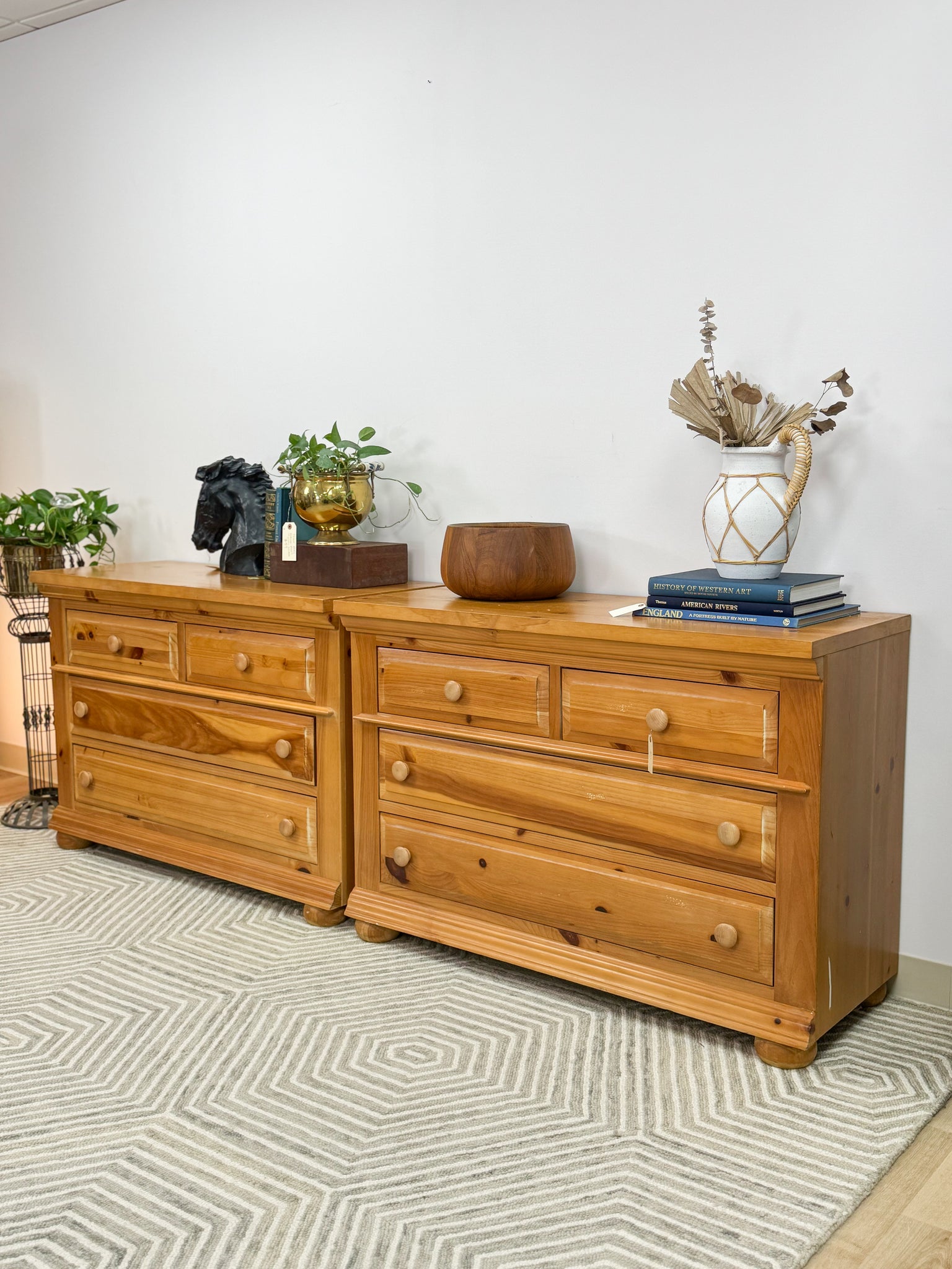 This is a beautiful pair of oversized solid pine chests of drawers. They are in excellent condition and have been made with solid wood. The drawers slide with ease. There are some spots of wear as shown but they are minor.