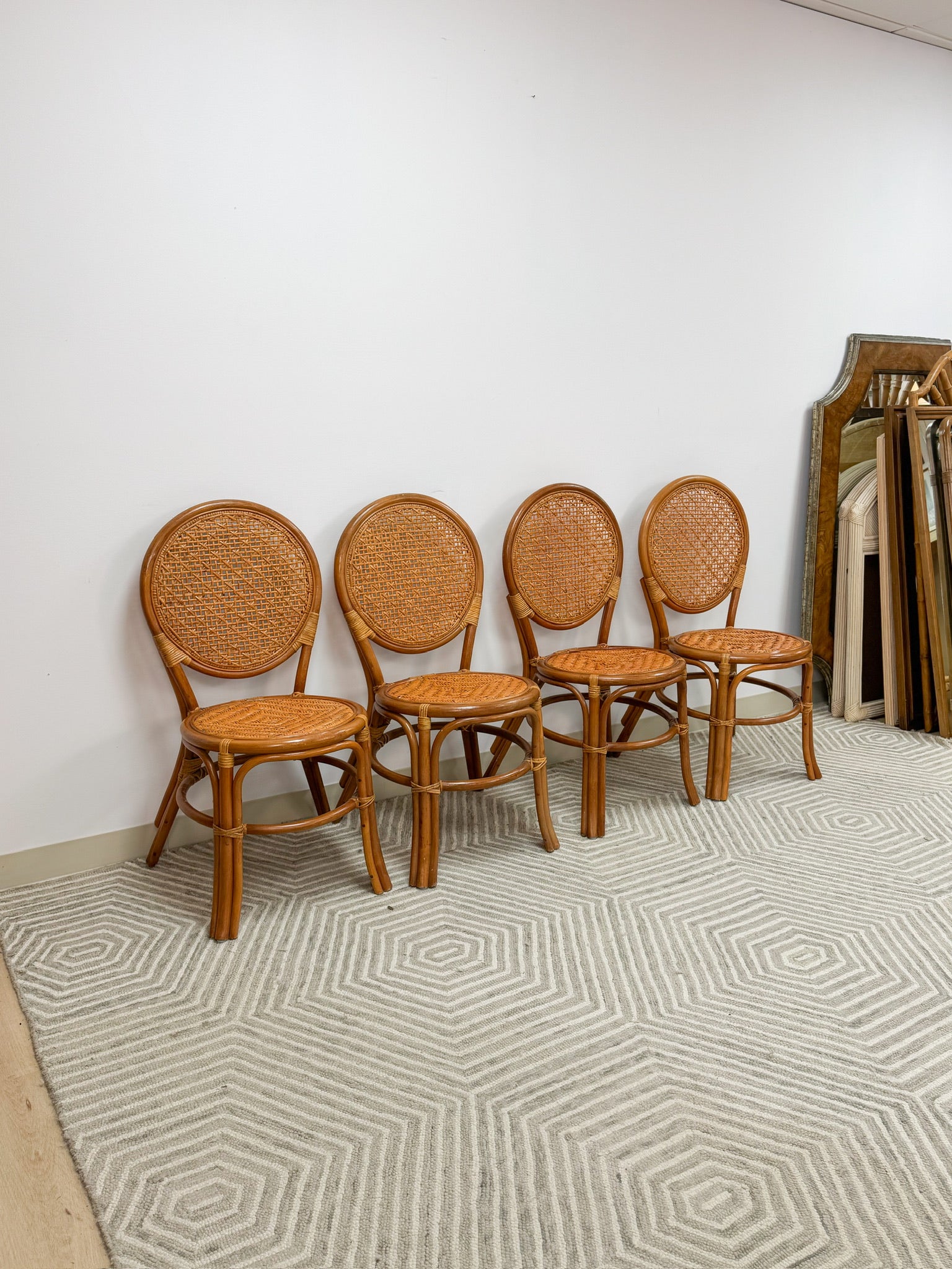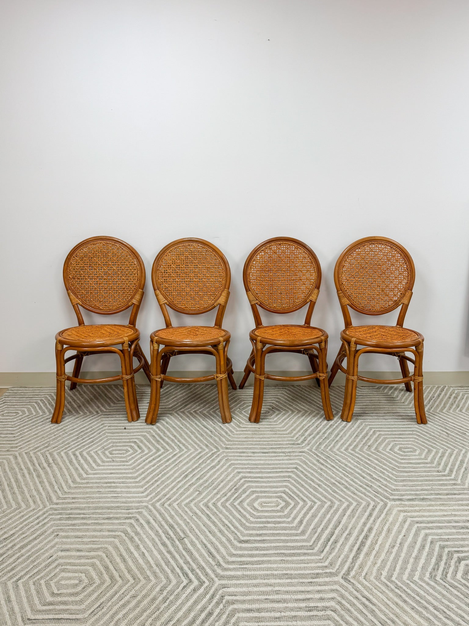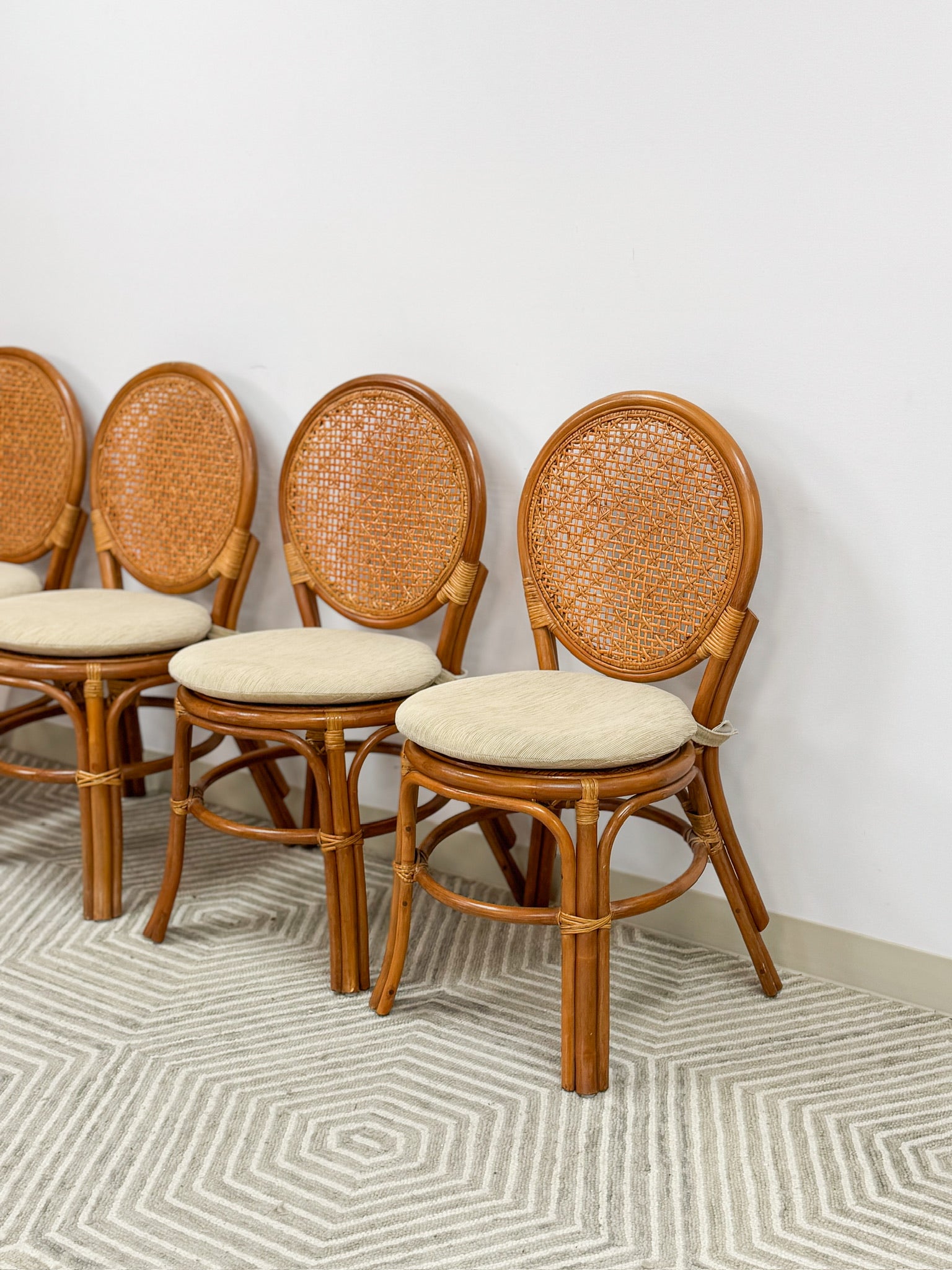 This is a beautiful set of rattan and cane dining chairs. These are a gorgeous natural honey color and have lovely cushions that can be easily attached and removed. These chairs are sturdy and are a perfect addition to any dining or kitchenette space!