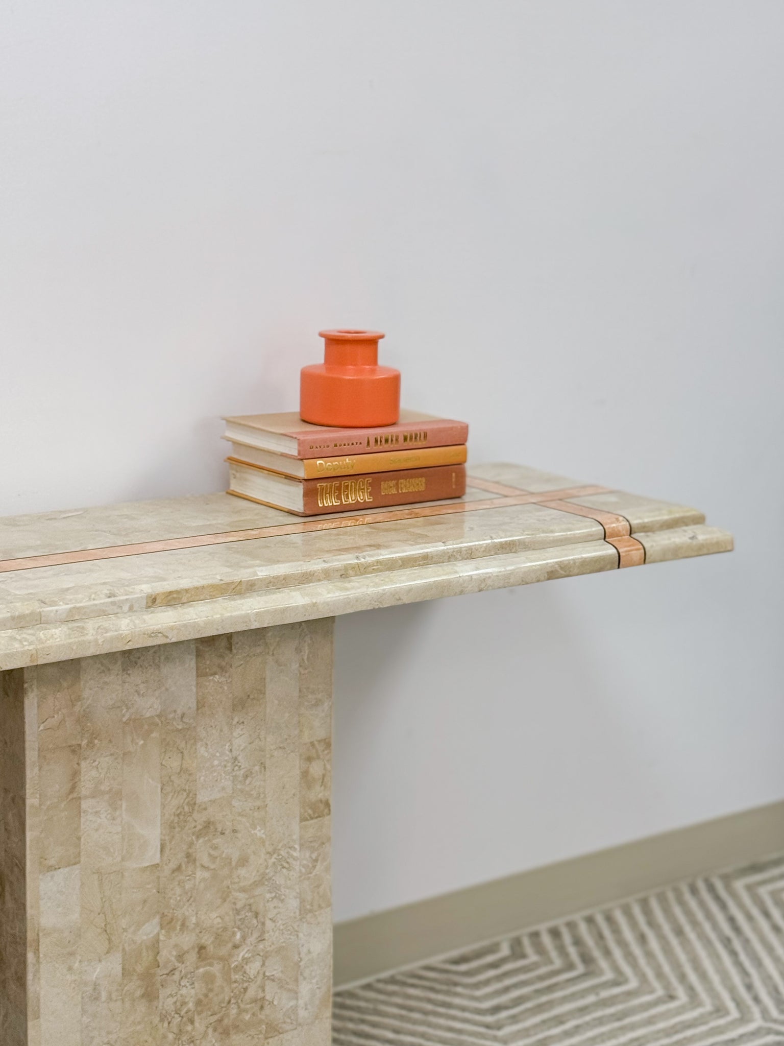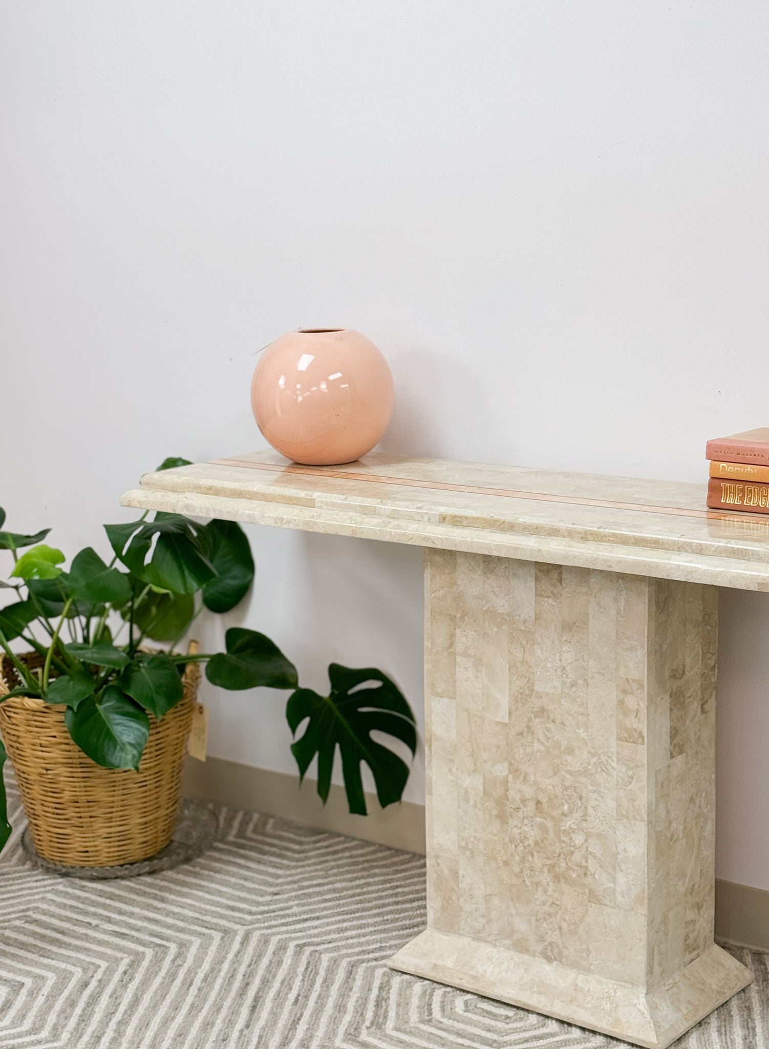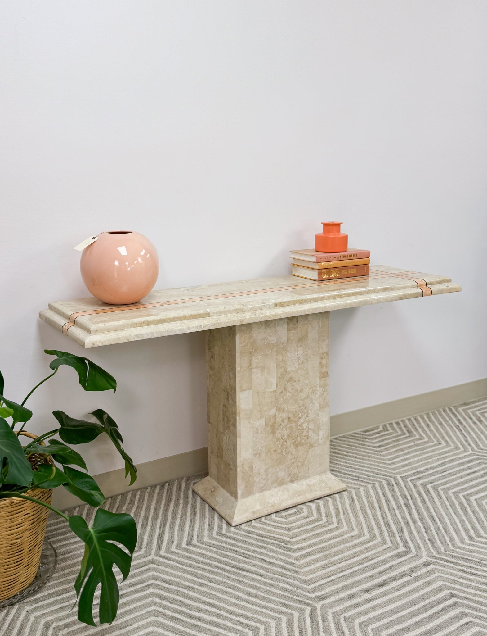 This is a beautiful tessellated stone console table. It is a vintage piece from the 80s and is perfect for an entry, behind a couch or even as a multifunction hall table. It has a gorgeous peach and tan color combo and looks heavy but is actually fairly easy to move from place to place.