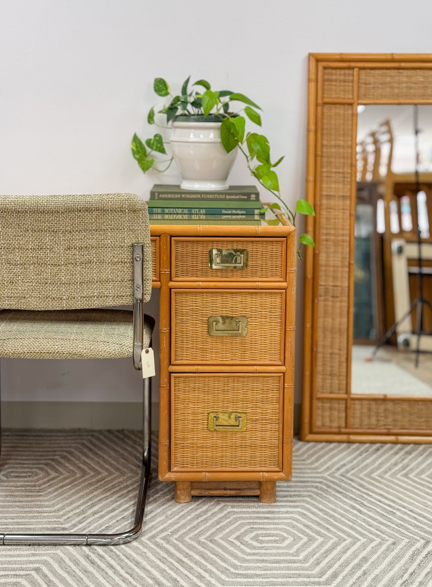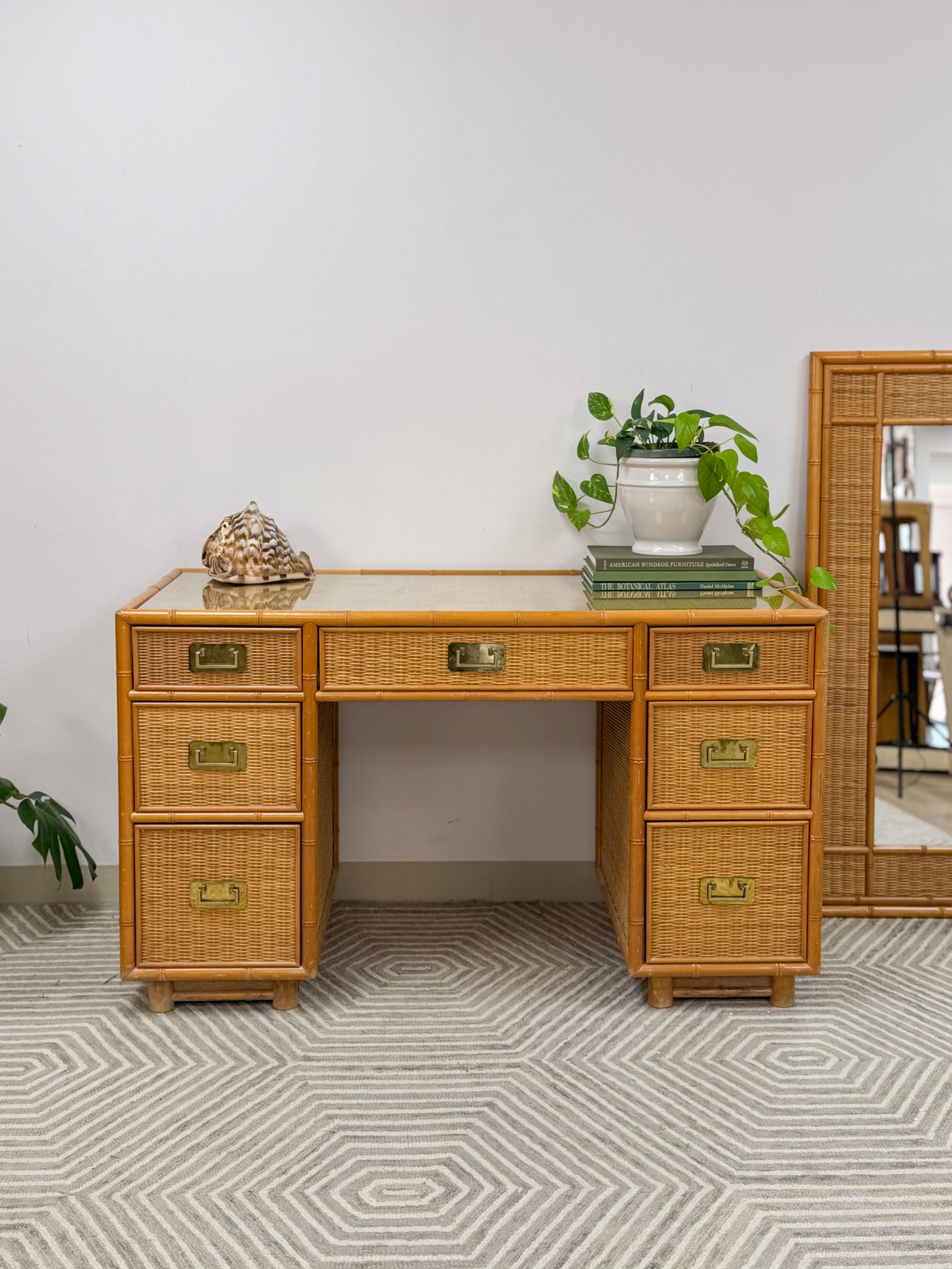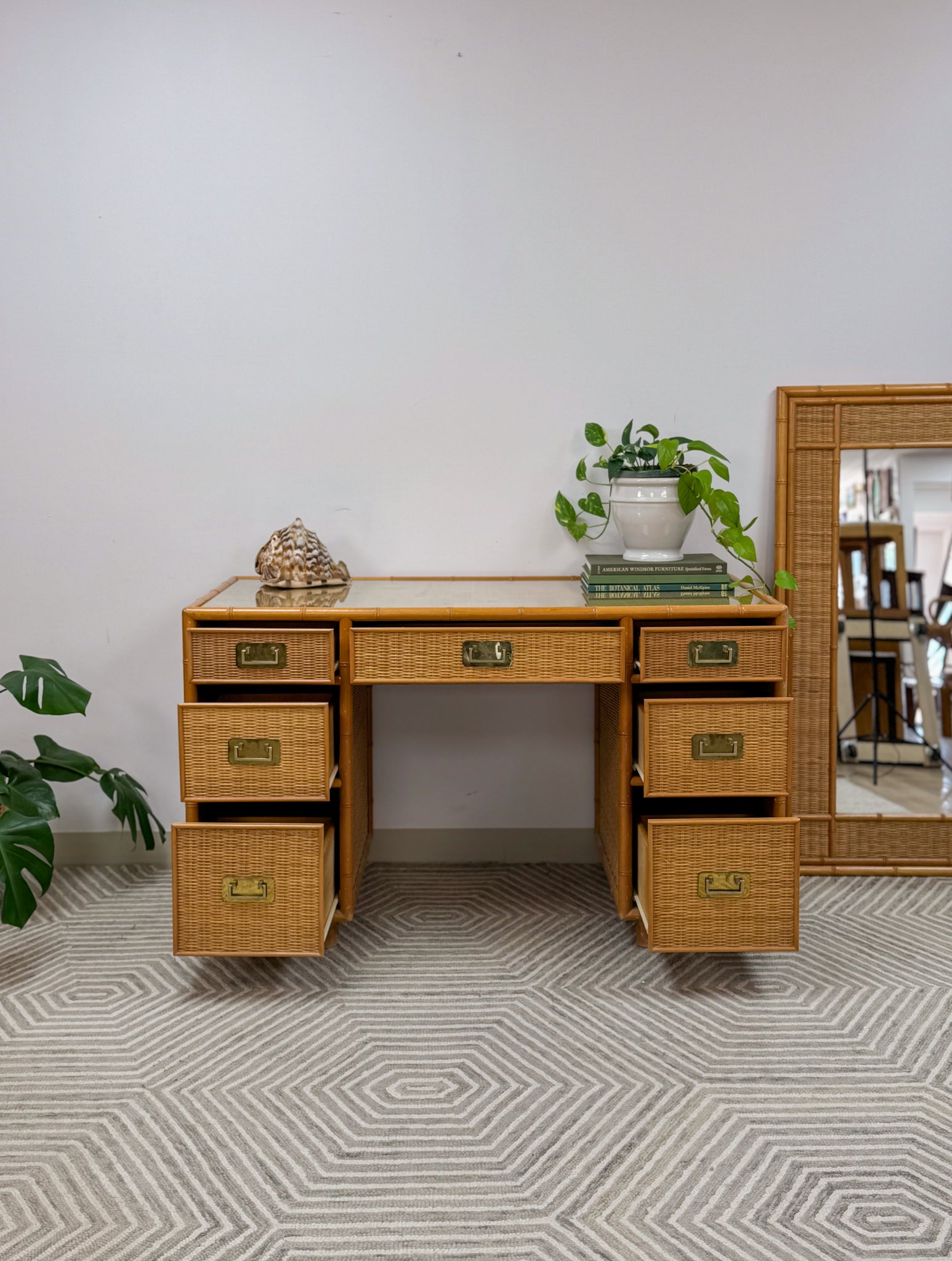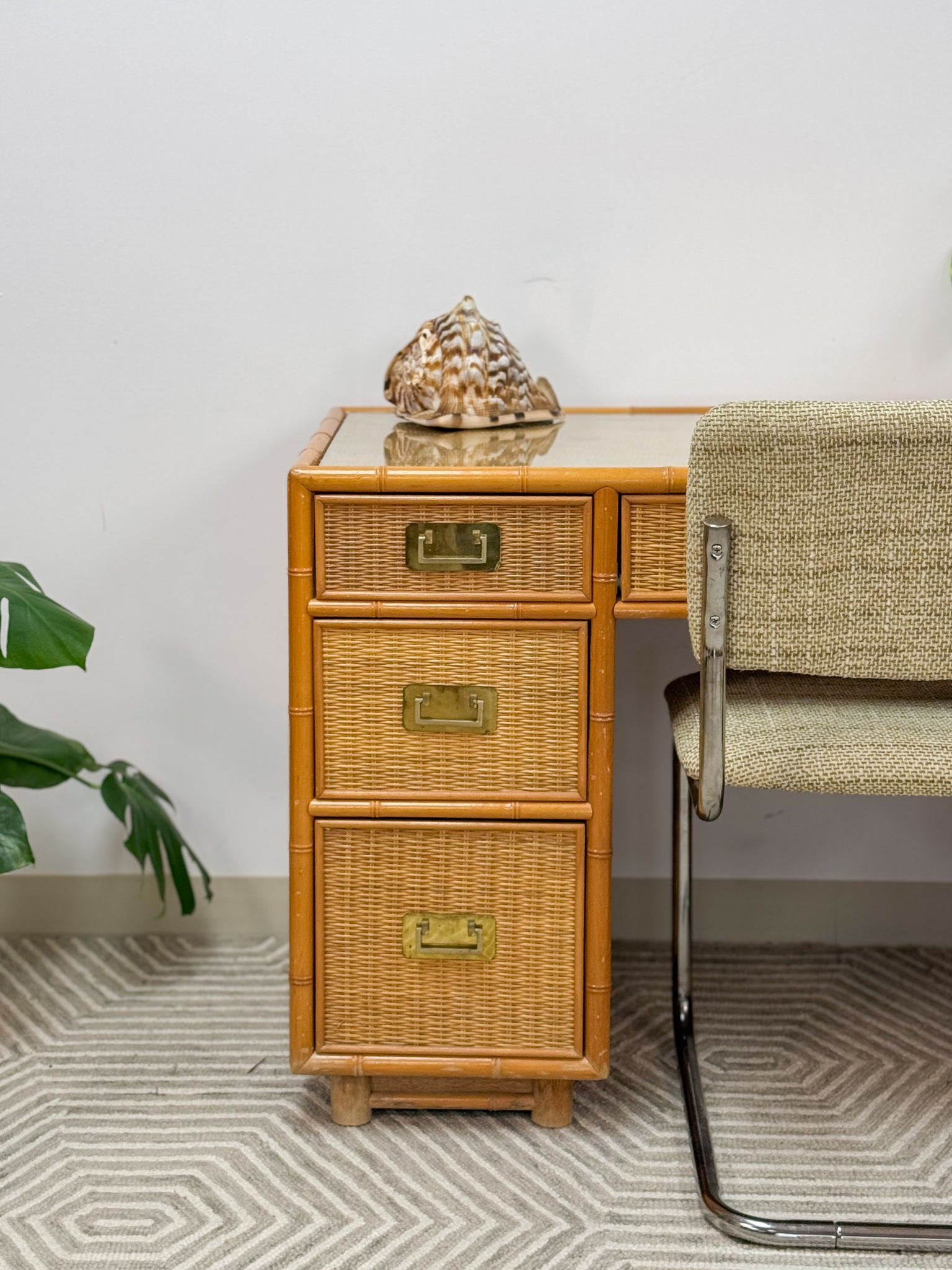 This is a beautiful vintage bamboo and wicker mid century style desk. It has loads of storage and drawers that open and close with ease. The hardware is all brass and there is a glass top. The bottom of the desk has some wear and there is a small chip in the back corner of the glass. It’s overall in good condition but could use some oil/ a little refresh at the base. The price reflects the wear.