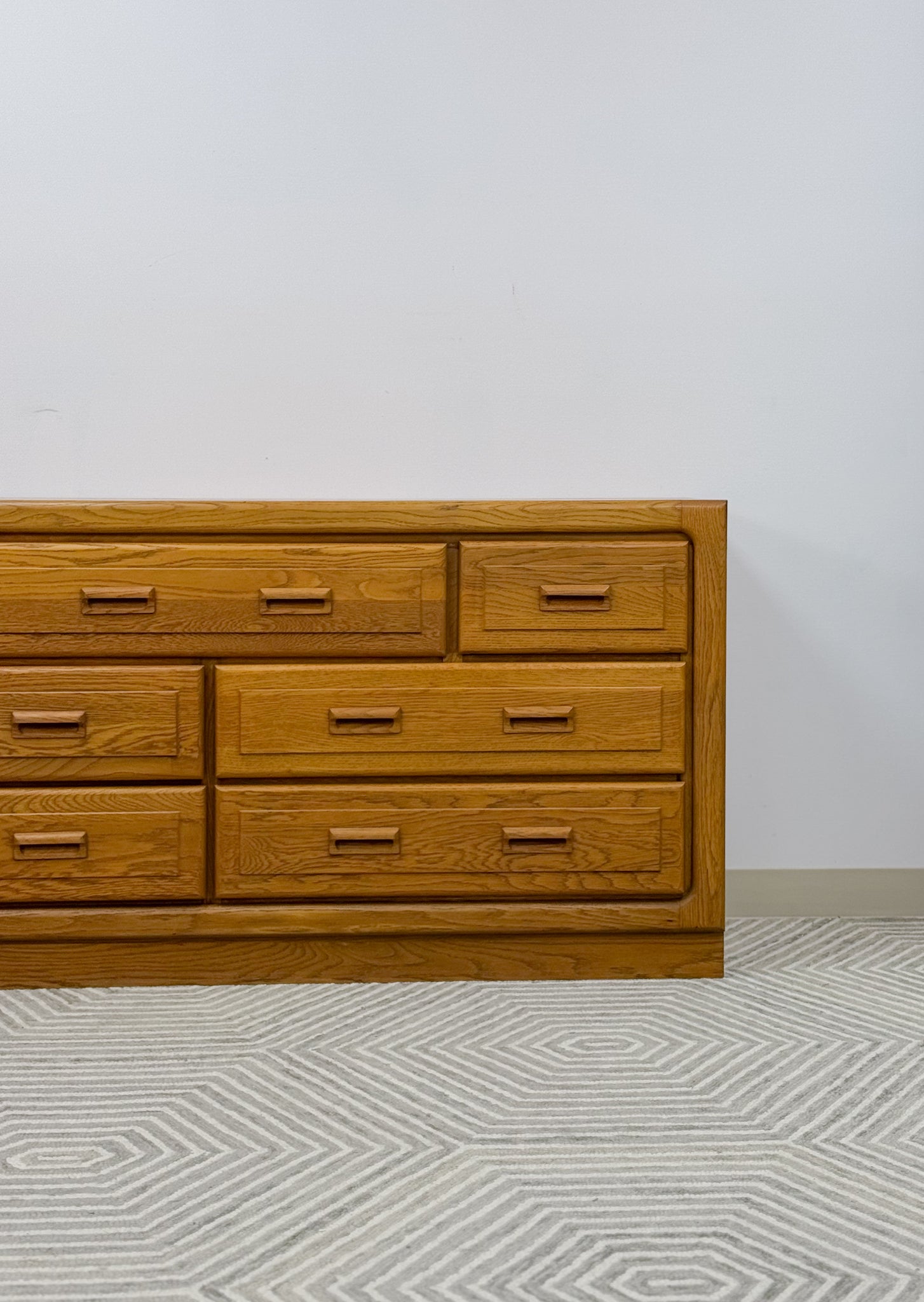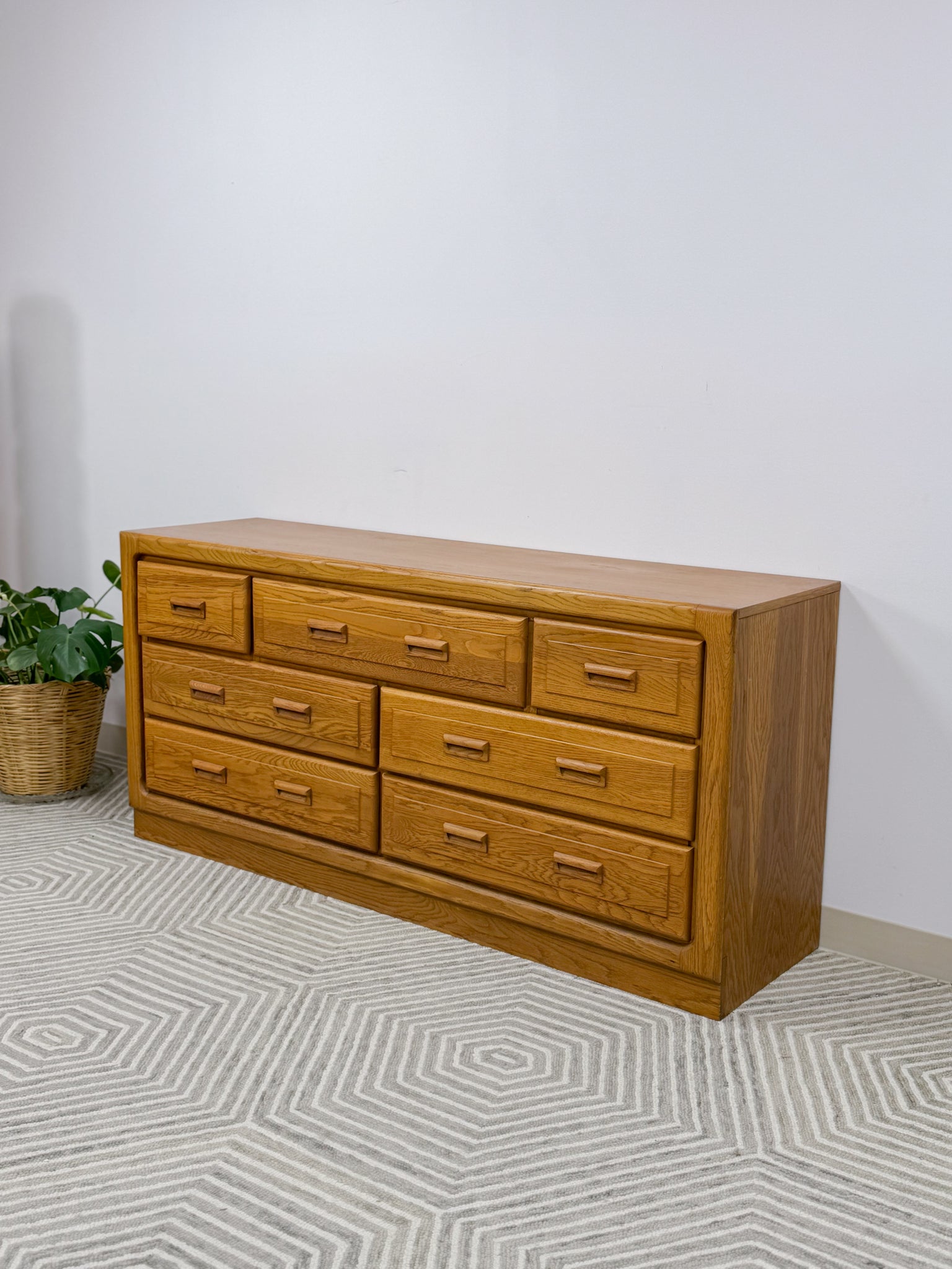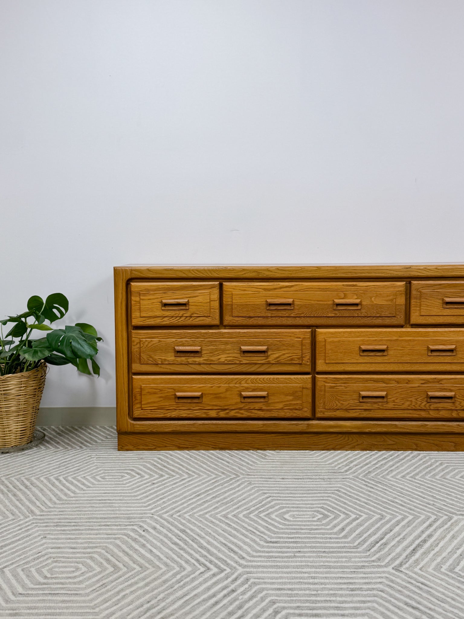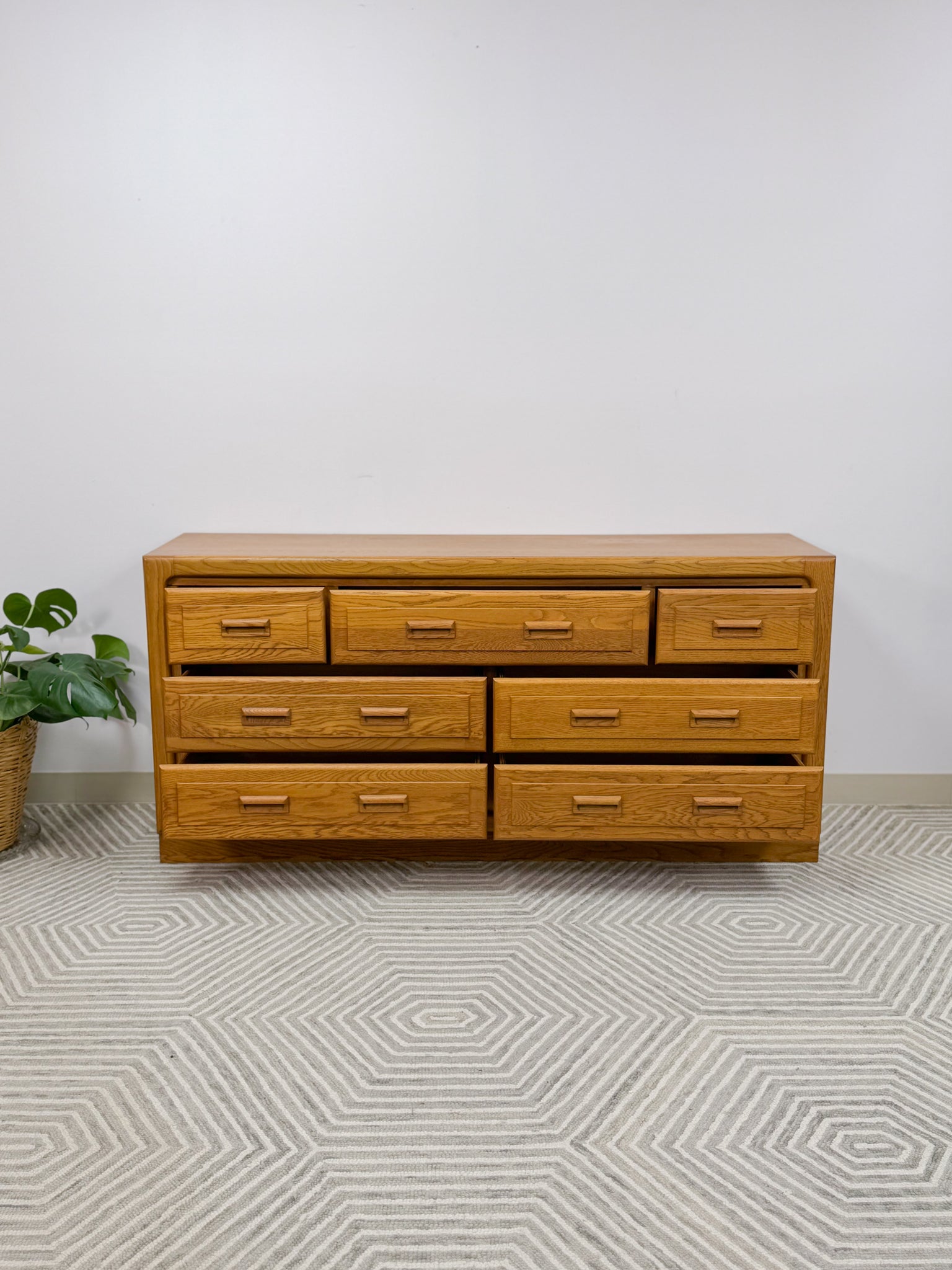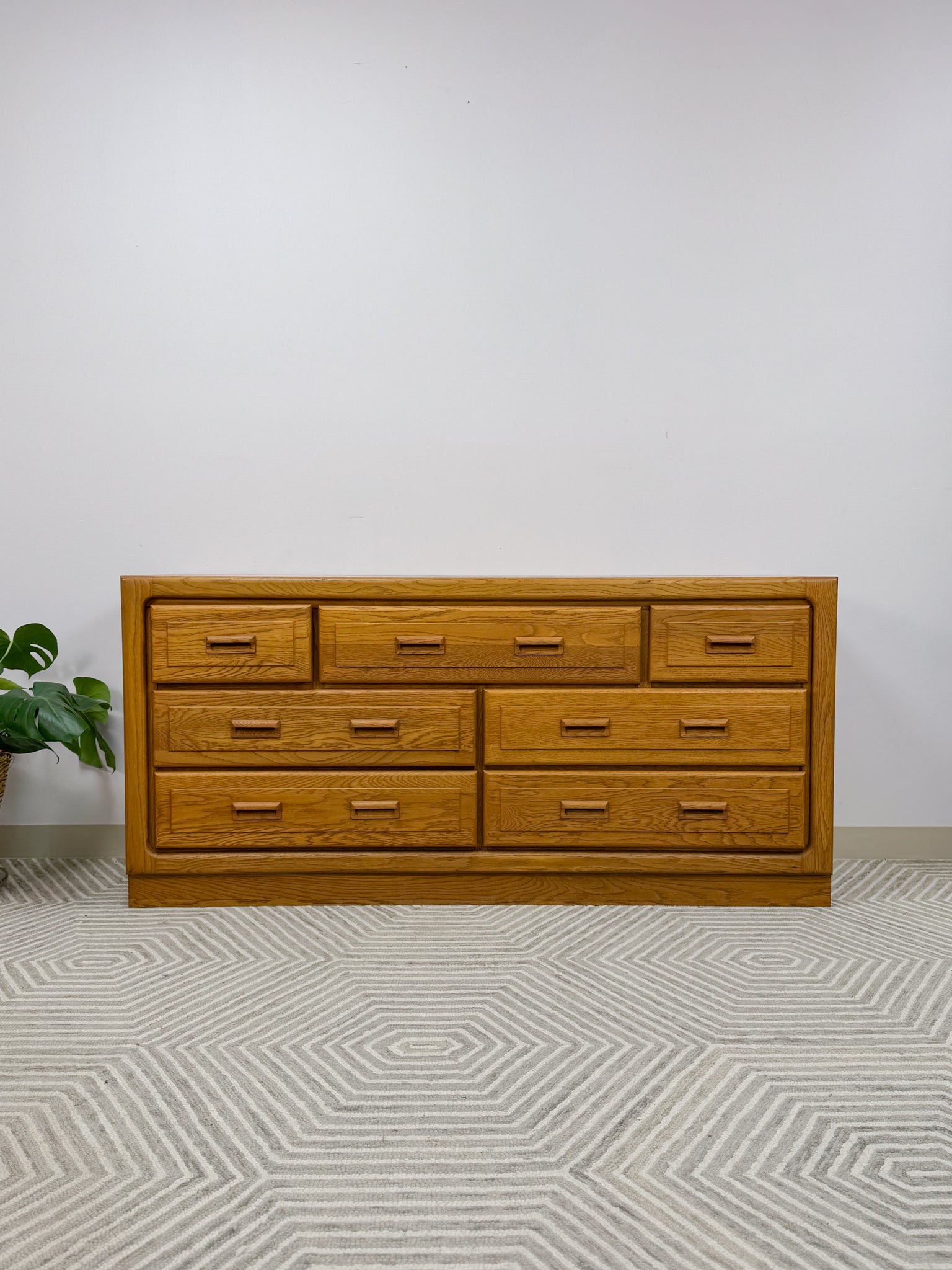 This is a beautiful oak colored mid century modern dresser. It is a vintage style and has 7 drawers that all glide with ease. The hardware is wooden and original and the dresser has simple sleek lines.