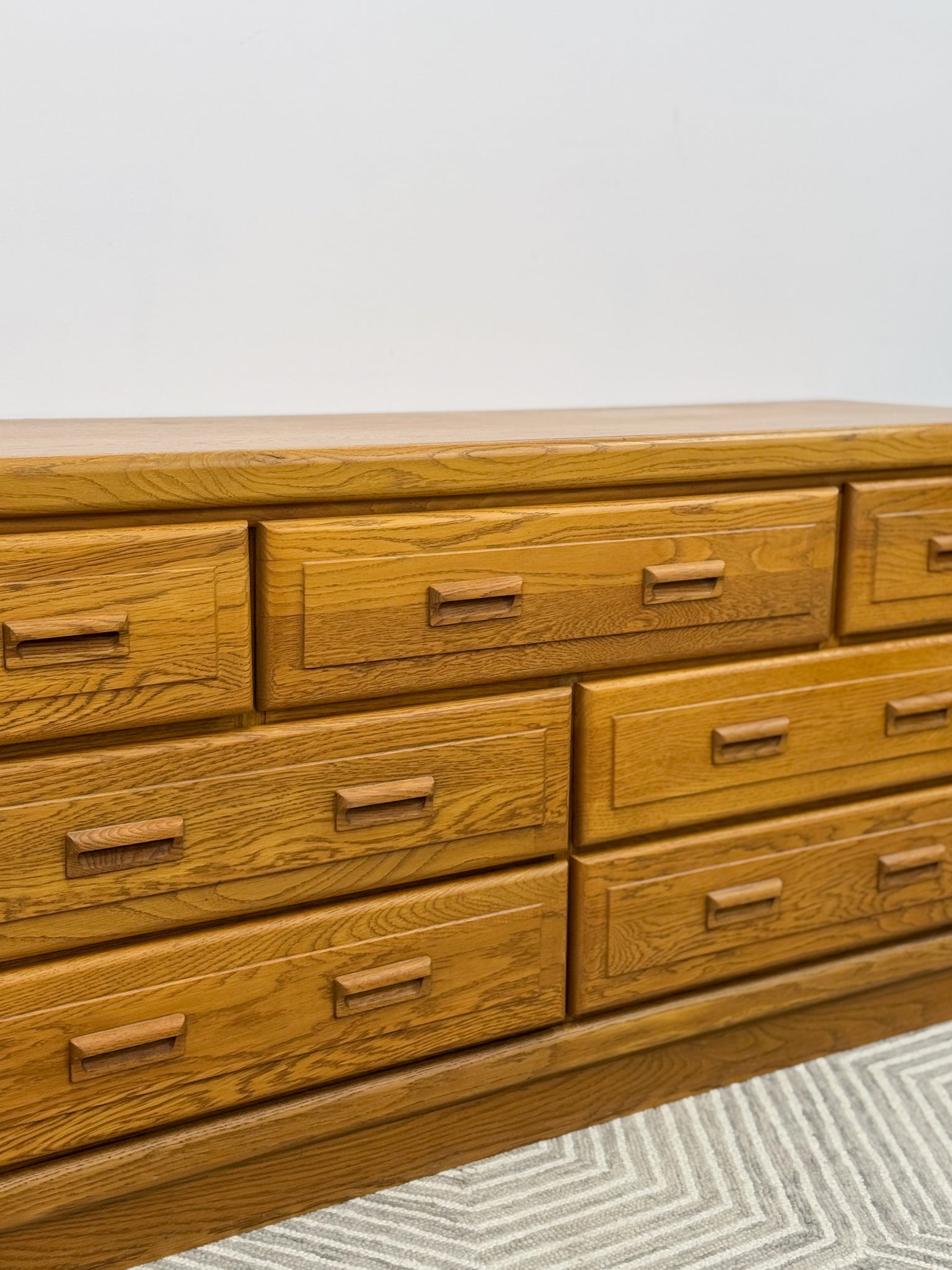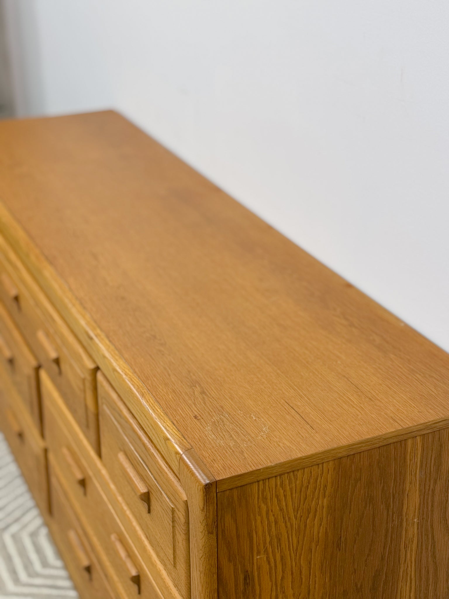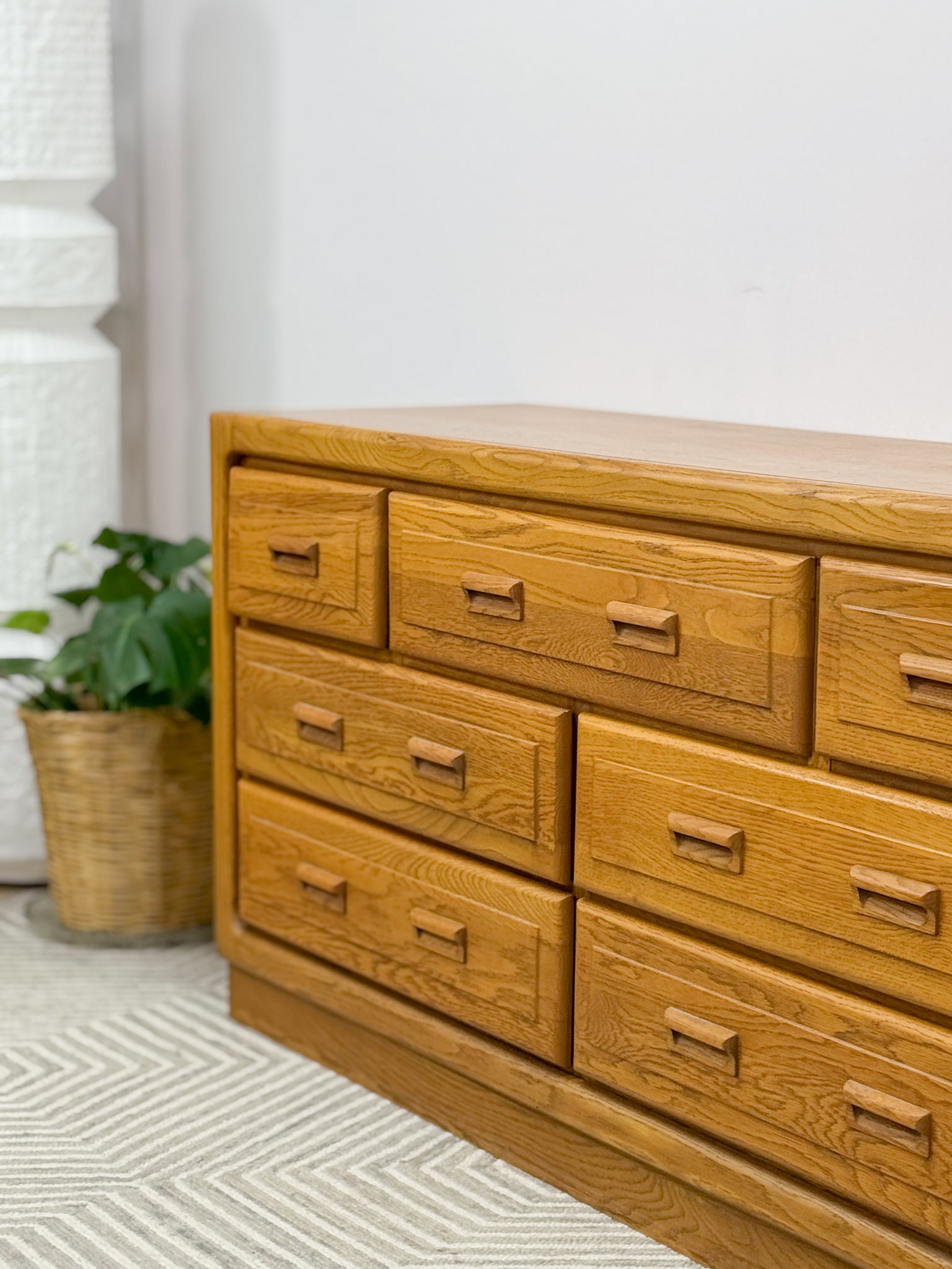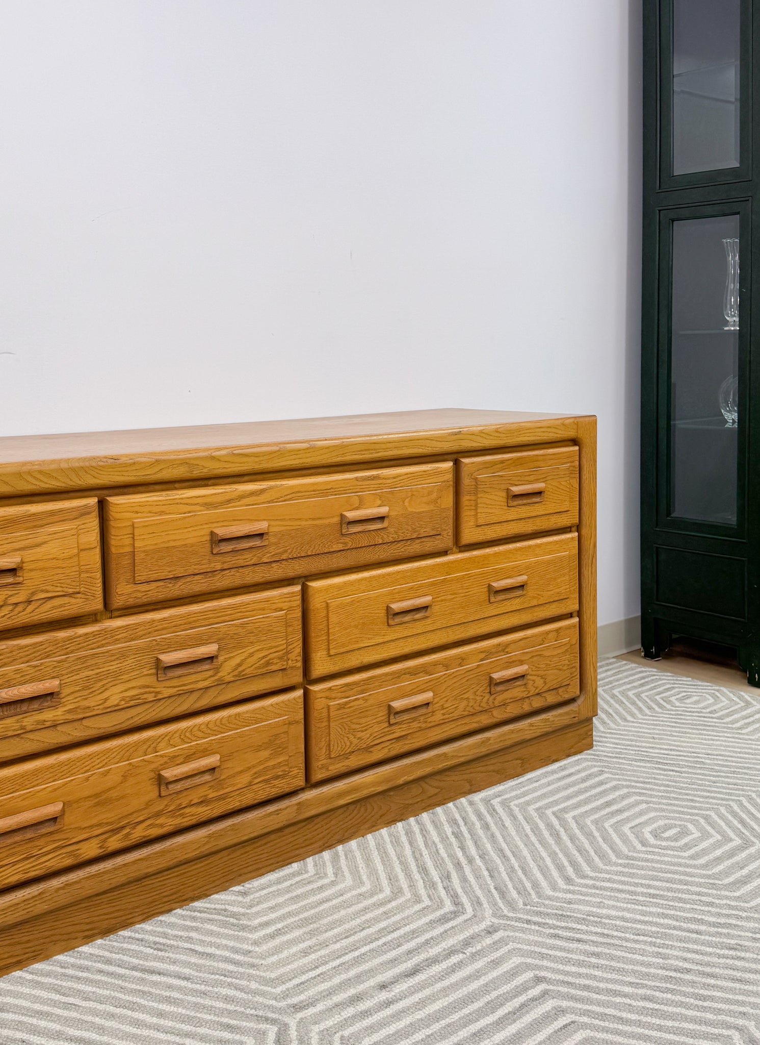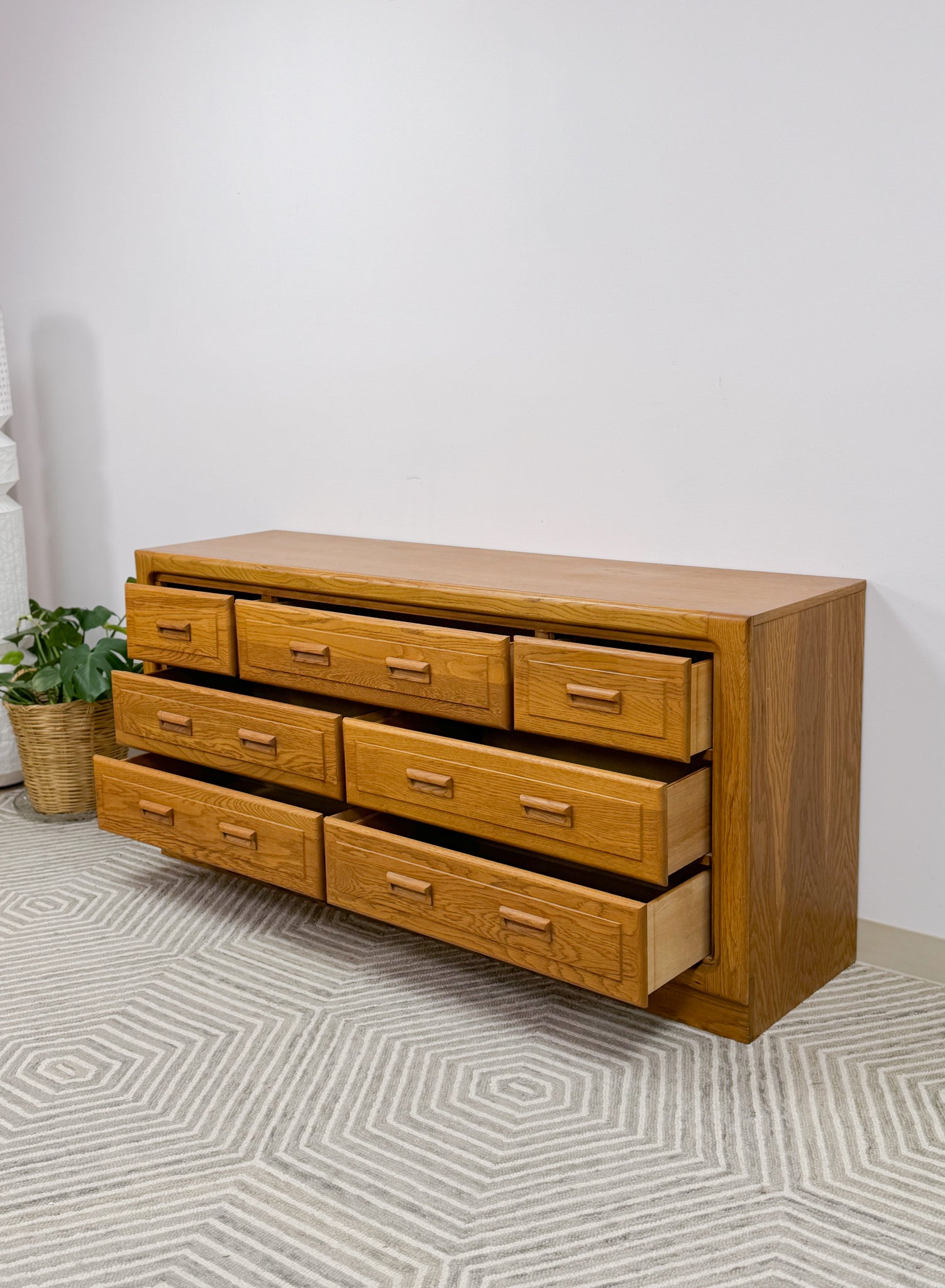 This is a beautiful oak colored mid century modern dresser. It is a vintage style and has 7 drawers that all glide with ease. The hardware is wooden and original and the dresser has simple sleek lines.