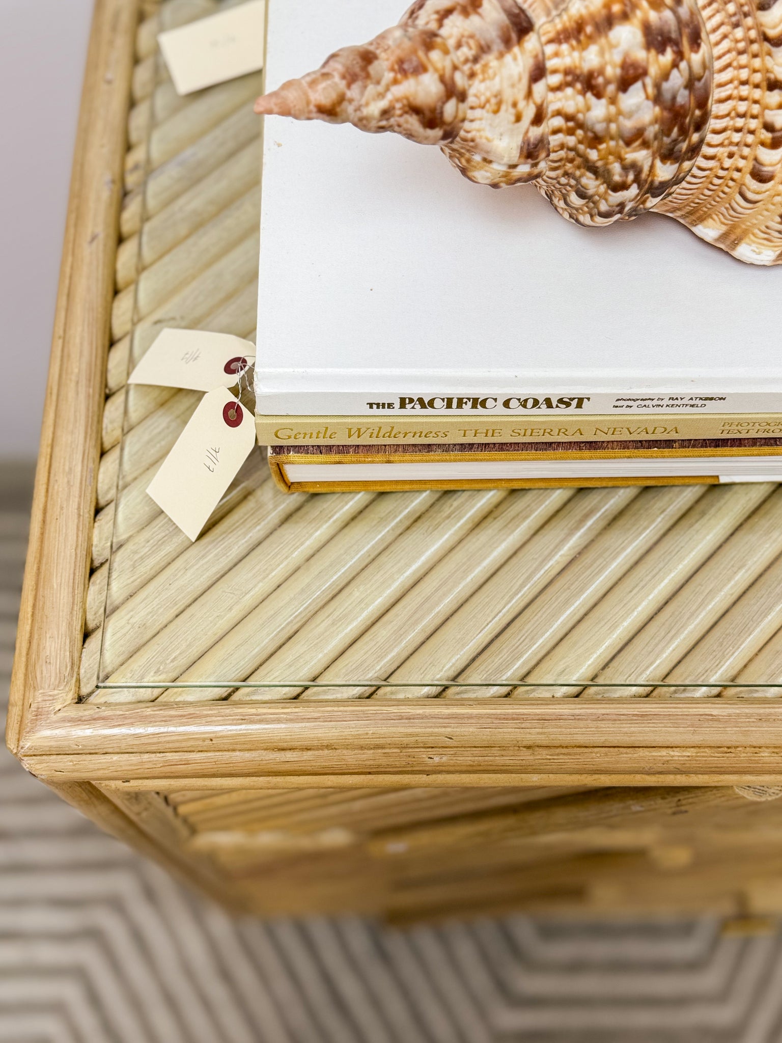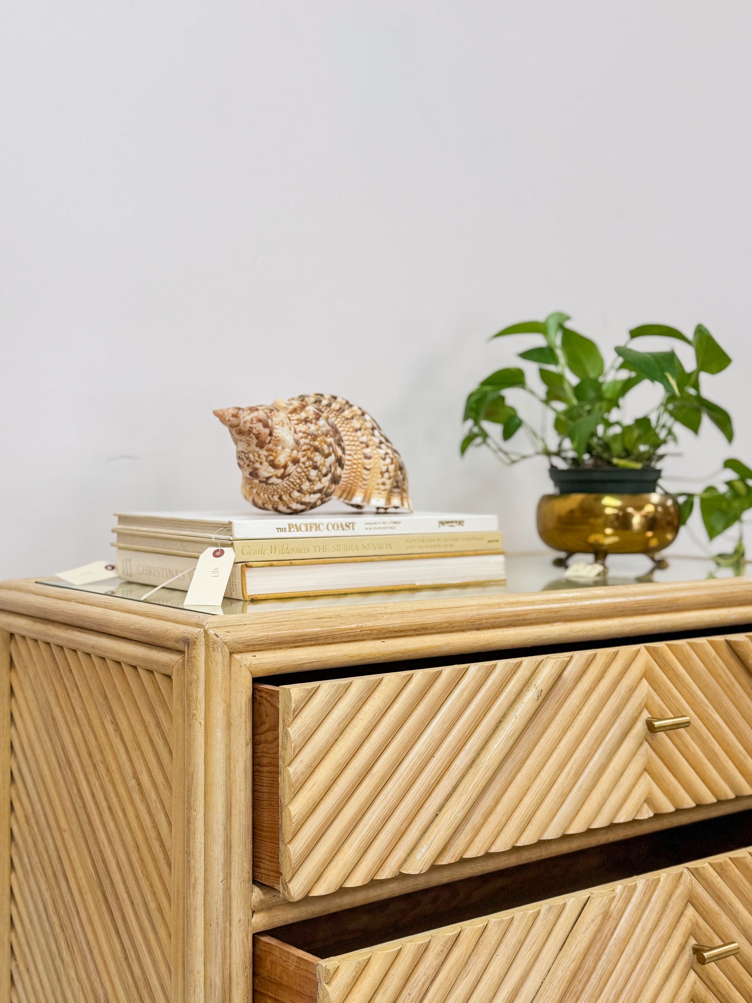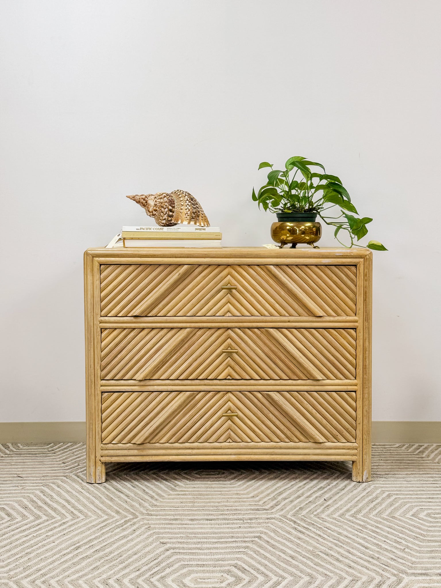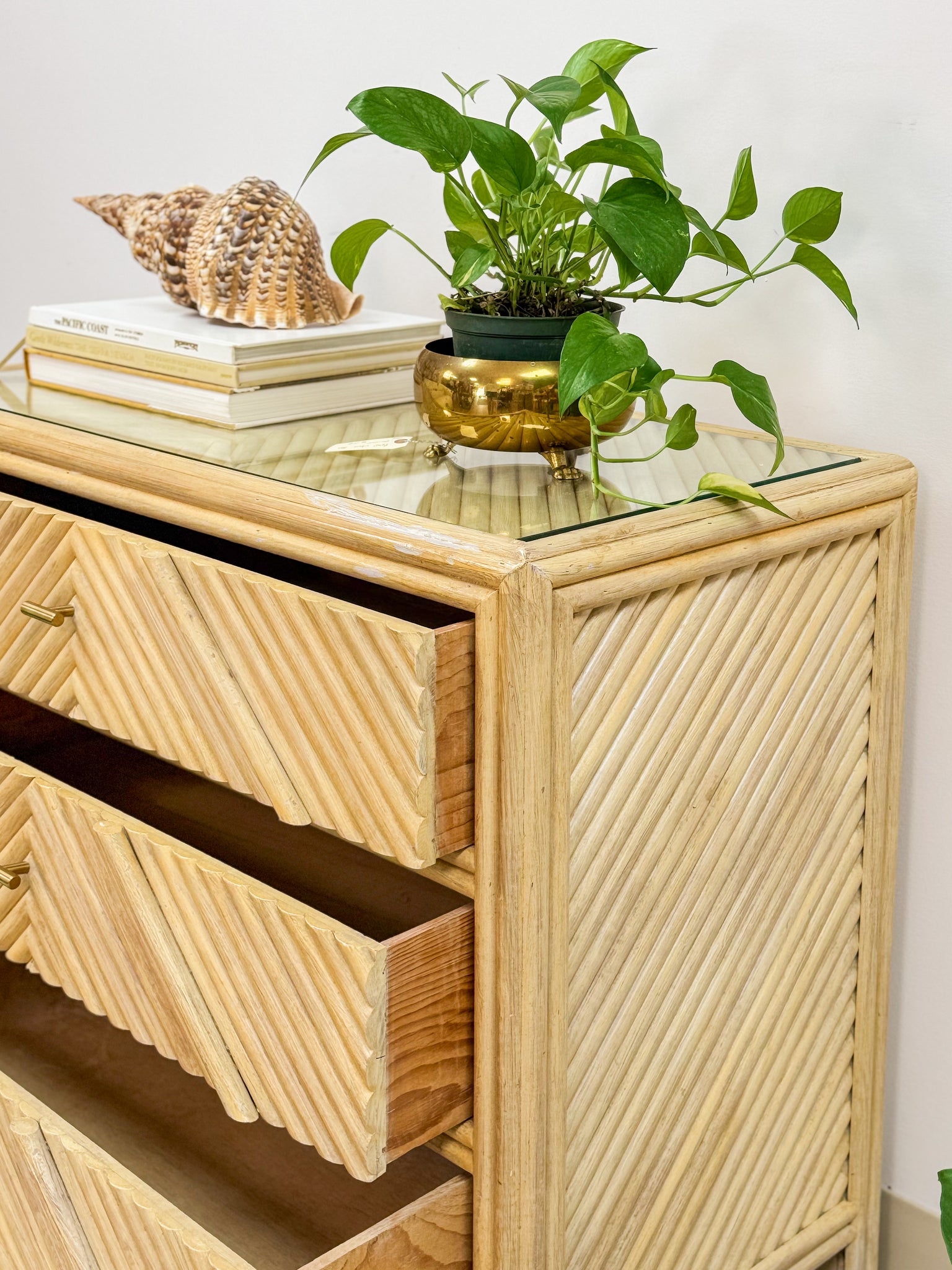 This is a beautiful vintage rattan chest of drawers. The drawers all glide with ease and the piece is made of solid wood and rattan. It has a large pencil reed design and is a gorgeous light natural rattan color.