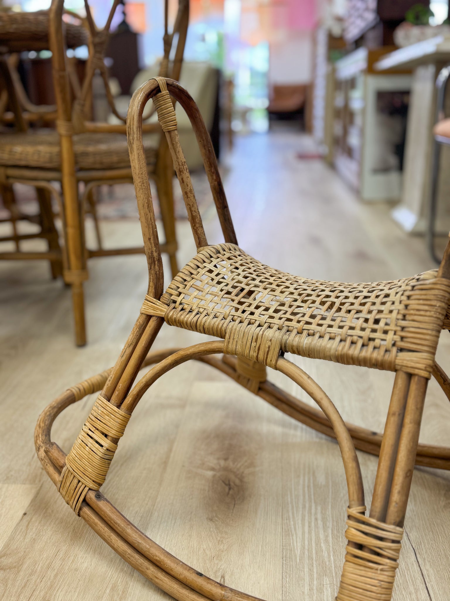 This is a rattanwoven children’s rocking horse. It’s a vintage piece and is in excellent condition with one small break in the weave on the seat as shown. It is perfect for a kids room or for display.