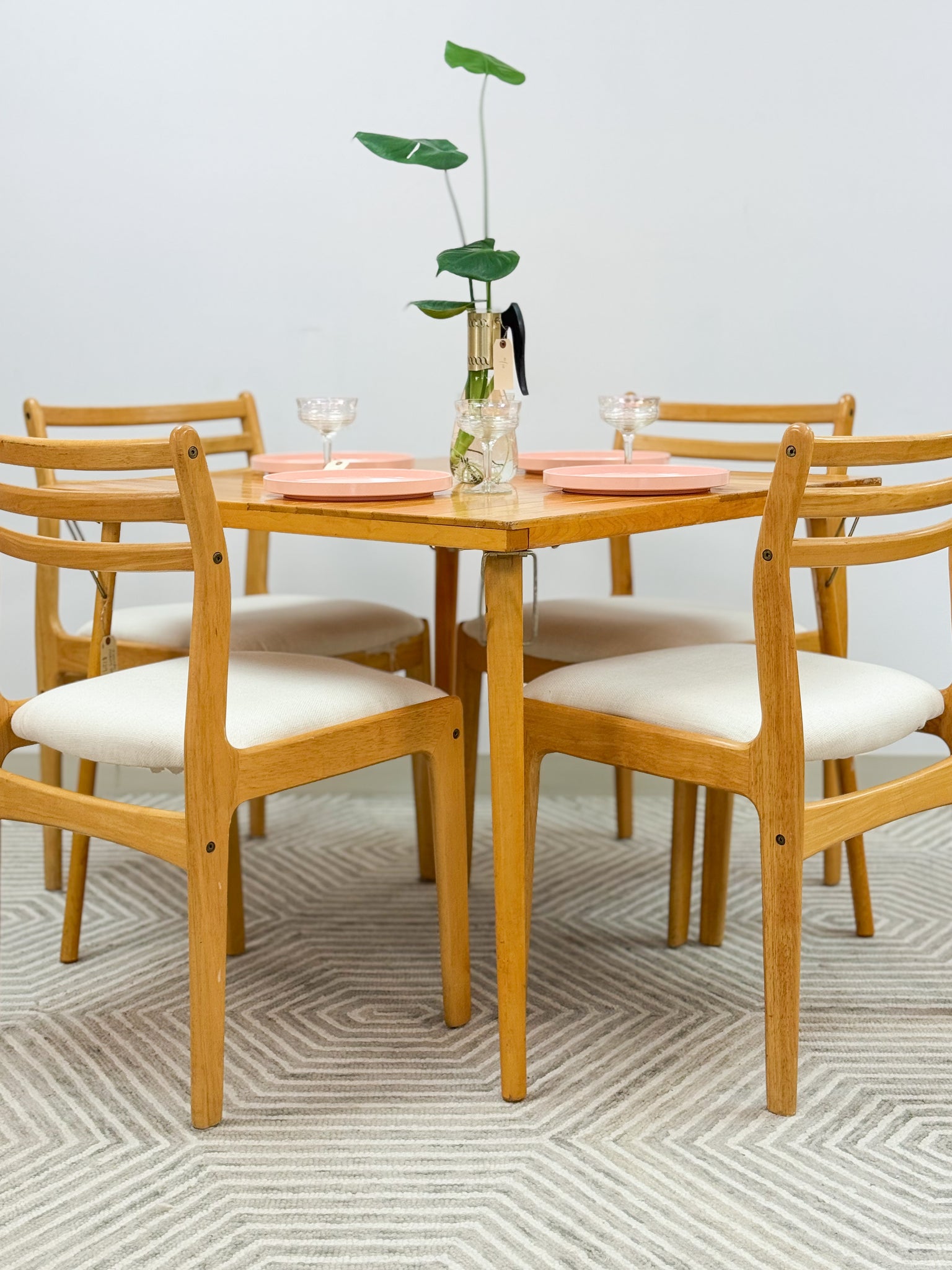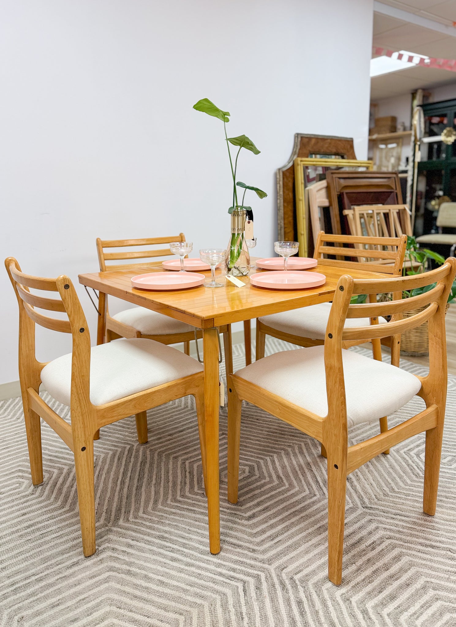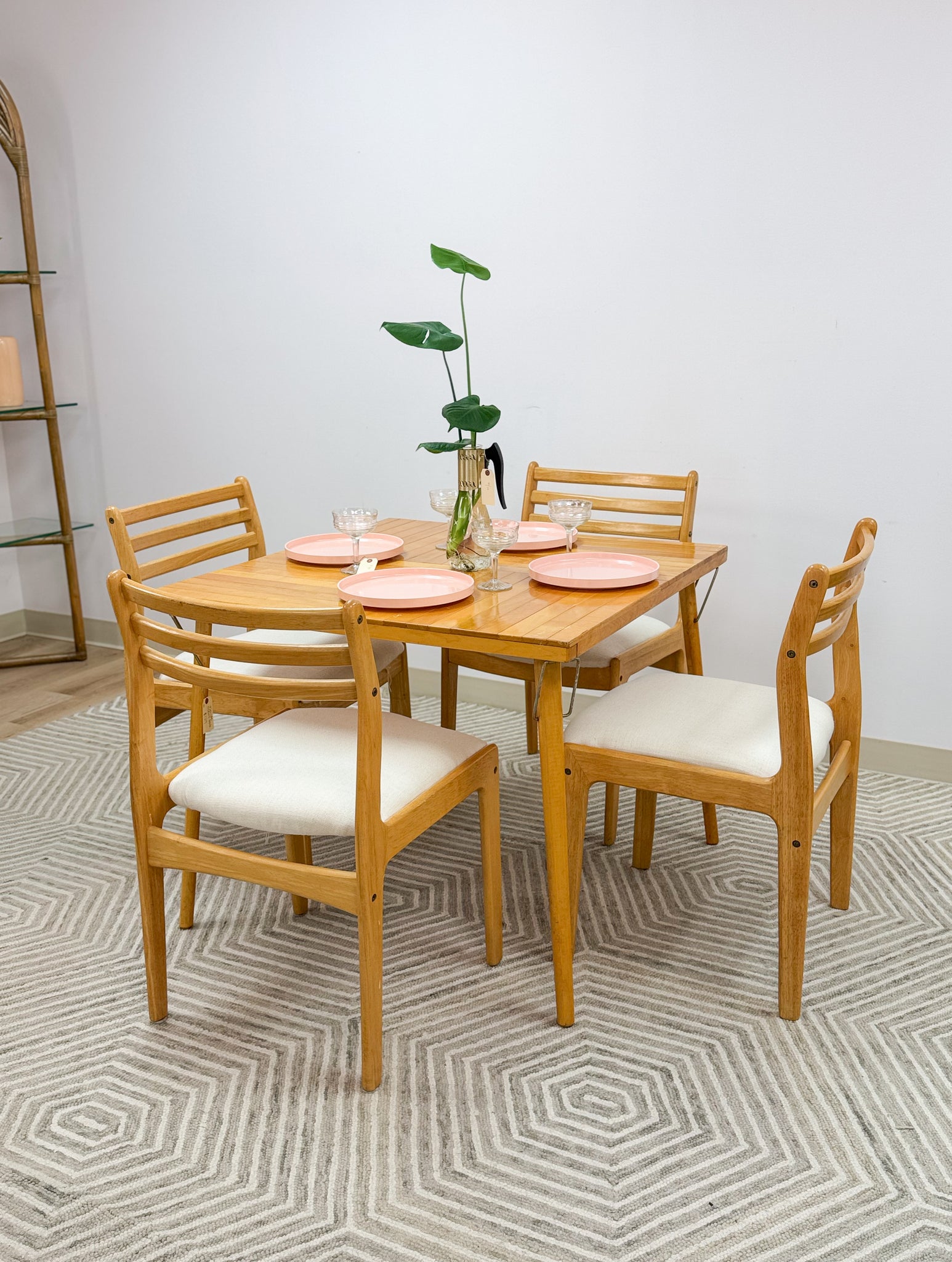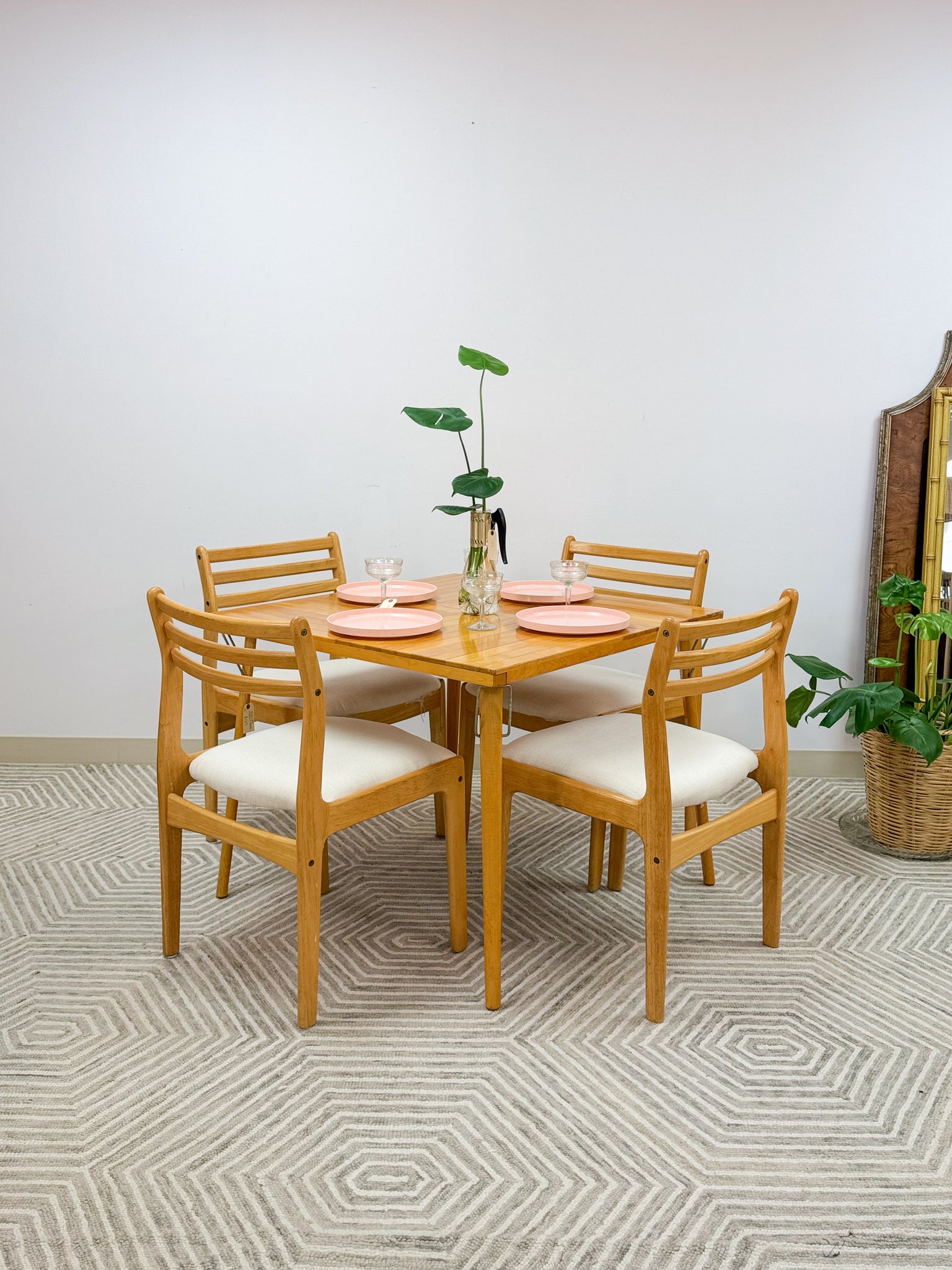 This is a beautiful vintage table and chairs set. It is a lovely honey colored wood. The table and chairs are all solid wood. The table is a very cool brand that folds down flat. The chairs do not fold because they are like normal dining chairs. They have been professionally reupholstered also.